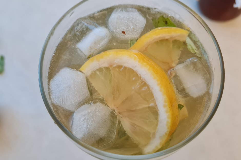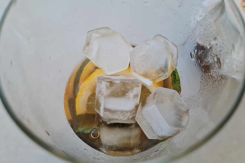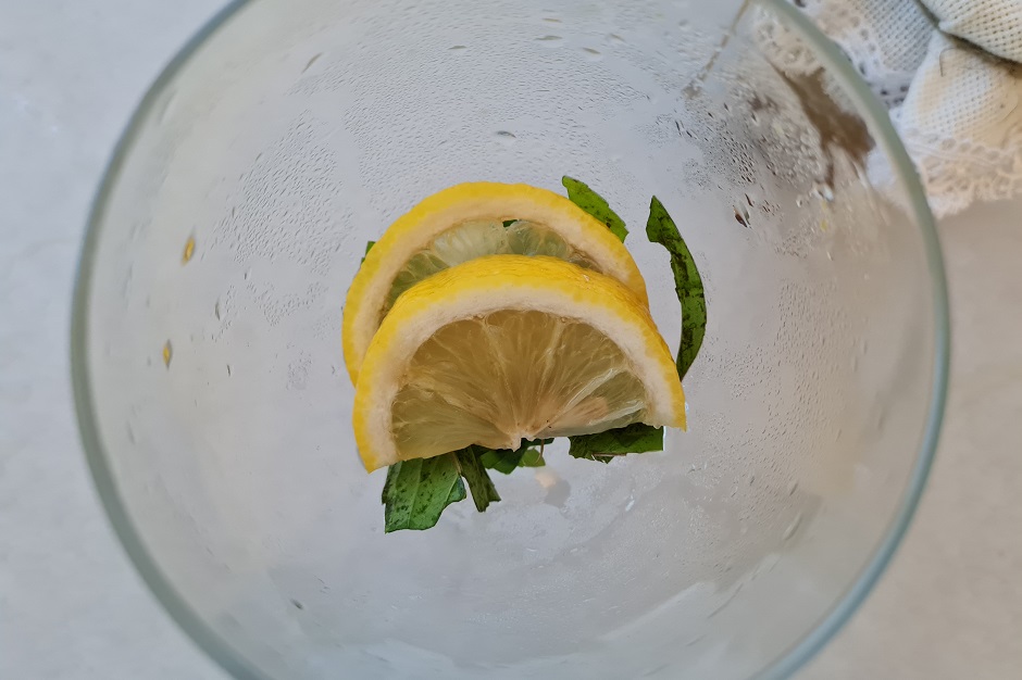 Сначала помните пальцами листики мяты и положите их в бокал. Туда же — срез лайма или лимона (две дольки), сок.