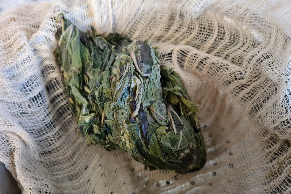 Тщательно отожмите траву. Добавьте сахар и доведите до кипения, всыпьте лимонную кислоту. Проварите пару минут, снимая пену.