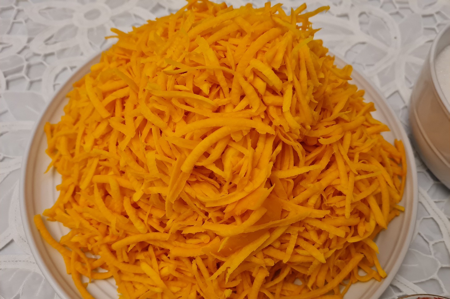 Тыкву очистите, нашинкуйте соломкой. Я использую кухонный комбайн. Если нет его, можно измельчить тыкву с помощью тёрки.