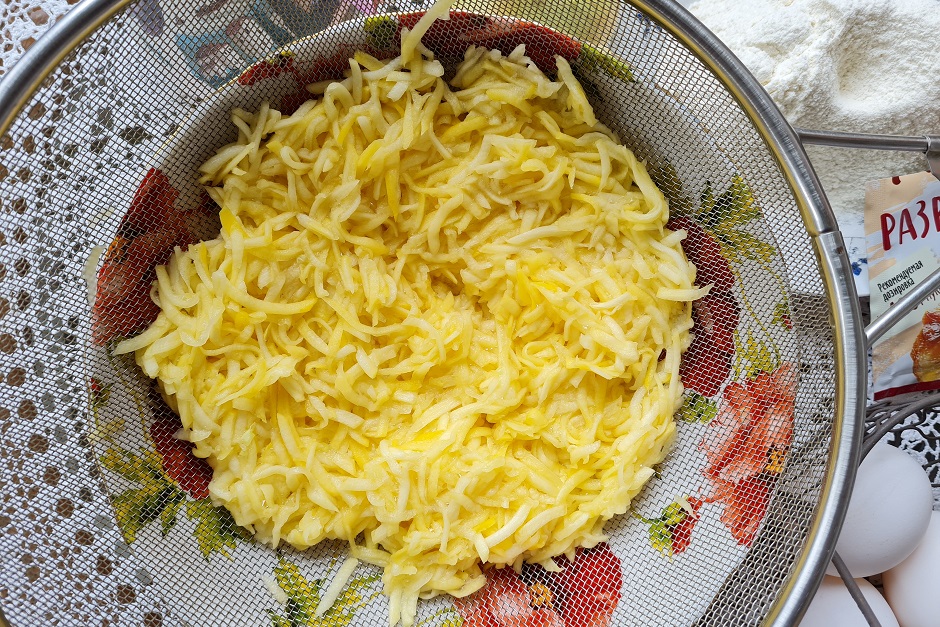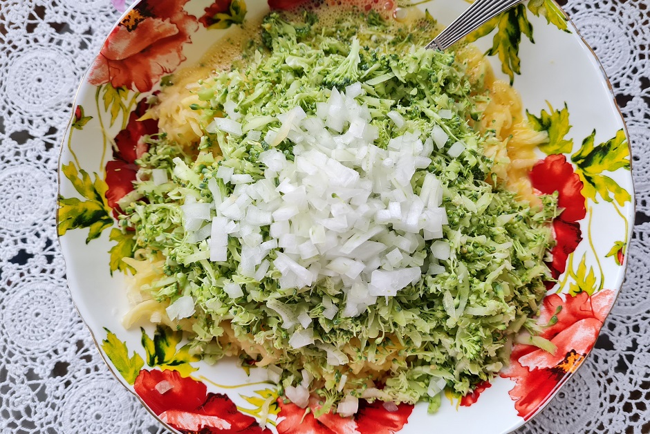 Кабачок (молодой чистить не нужно, а зрелый очистите от кожи и семян) натрите на терке с крупными ячейками или на комбайне. Переложите в дуршлаг, посолите и перемешайте. Пусть полежит, чтобы стекла лишняя жидкость. Мелко нарежьте брокколи. Либо пропустите через терку комбайна, это намного легче. Так же нарежьте мелко лук.