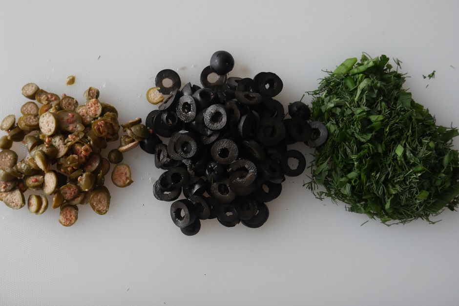 Когда огурцы почти готовы, добавить в брез все мясные продукты и залить бульоном. Добавить по вкусу рассолы из-под маслин, каперсов и огурцов, отваривать в течение 15 минут. В конце добавить каперсы и маслины, зелень, сразу снять с огня. Через 15-20 минут, когда солянка настоится, ее можно подавать. Сметана и лимон добавляются по желанию.