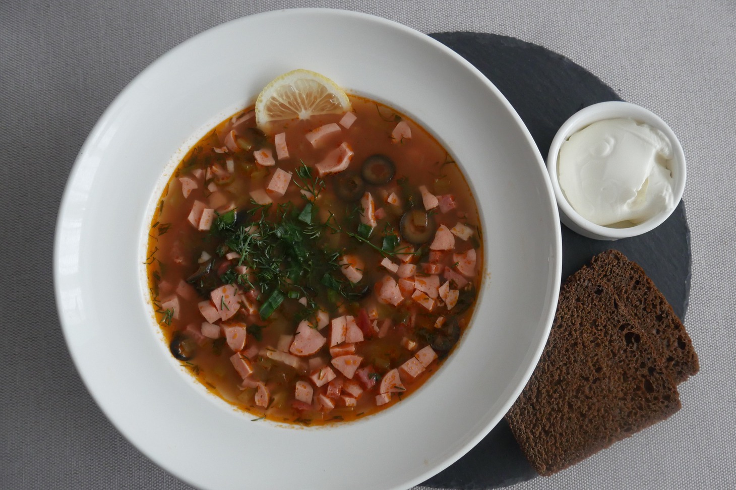 Все мясные продукты и огурцы для солянки режутся единообразно – либо кубиком одного размера, либо соломкой одного размера.