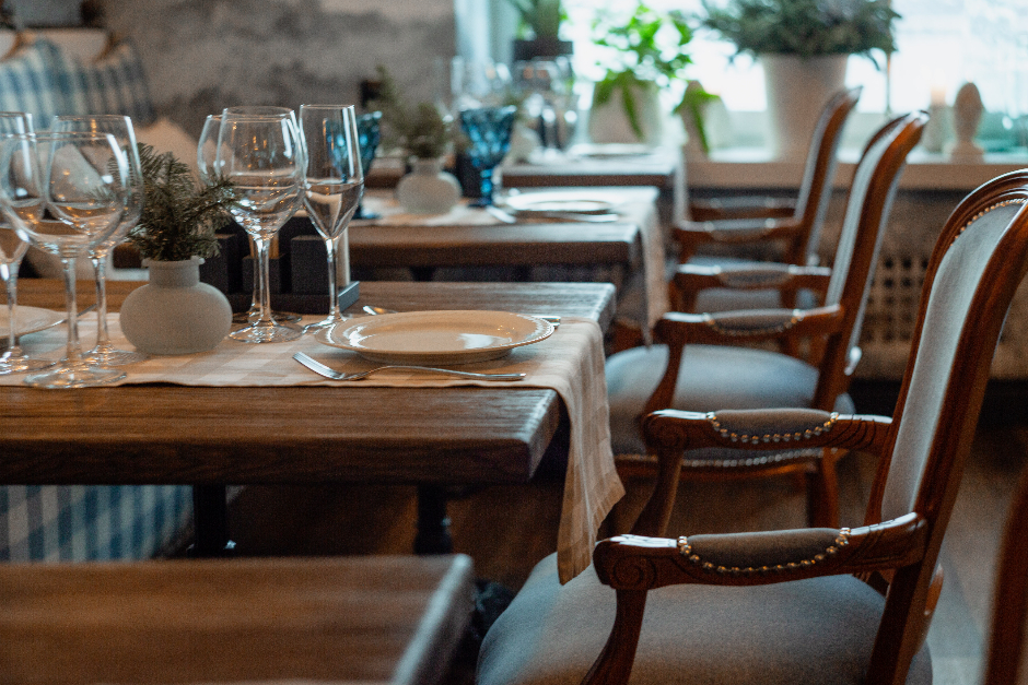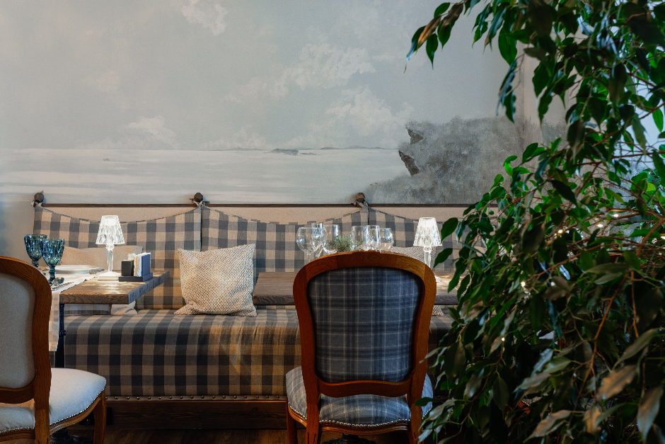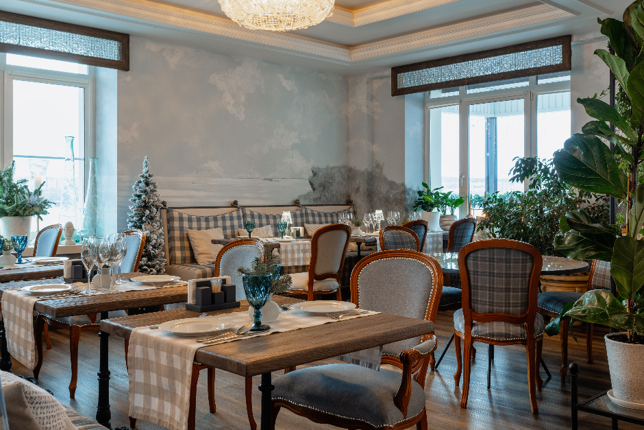 Интерьер представляет собой великолепное сочетание современного стиля и элегантной роскоши, и потому прекрасно подходит для изысканных завтраков, бизнес-бранчей и романтических встреч. Стены ресторана украшены росписью с изображением воды, облаков и деревьев в утренней дымке — знаете, такая отсылка к побережью Нормандии.