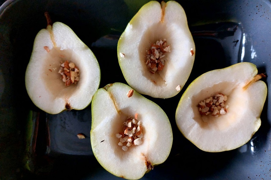 Делим груши пополам, удаляем сердцевину. Выкладываем половину порции измельченных орехов, добавляем сыр, снова орехи, тимьян. Запекаем груши при 180 градусах полчаса.