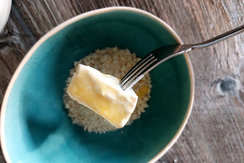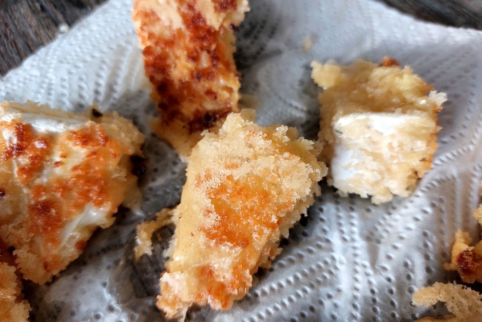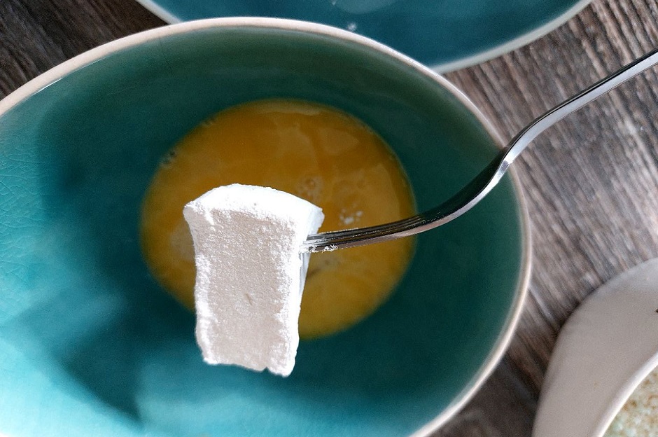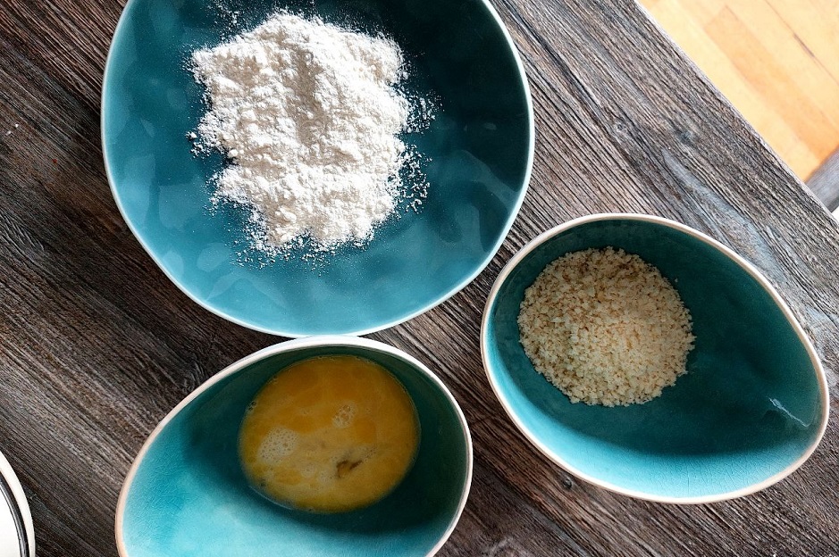 Разрезаем сыр на порционные треугольники. Готовим продукты для кляра: муку, взбитое яйцо, панировочные сухари.