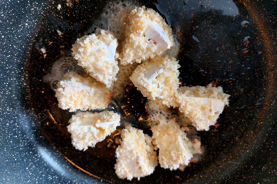 Обваливаем сыр в муке, затем в яйце и в панировочных сухарях. В сковороде нагреваем растительное масло. Обжариваем сыр по минуте с каждой стороны.