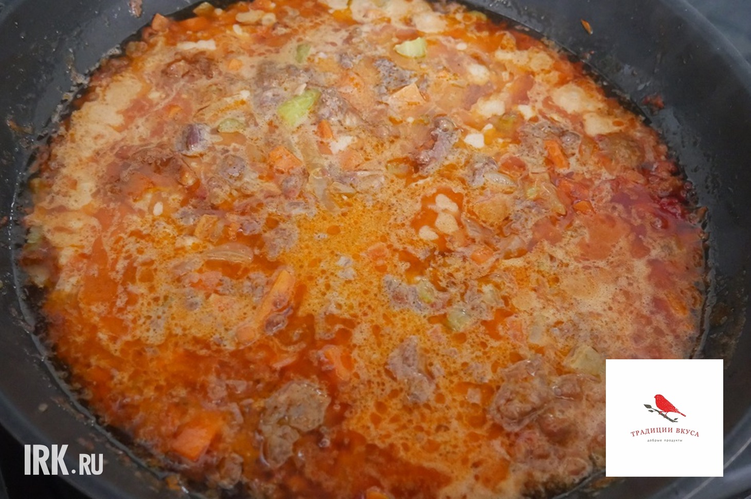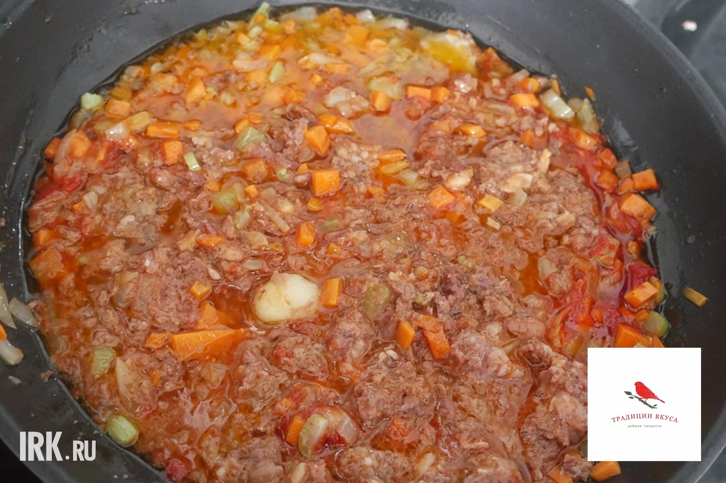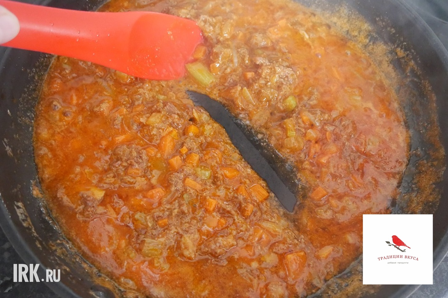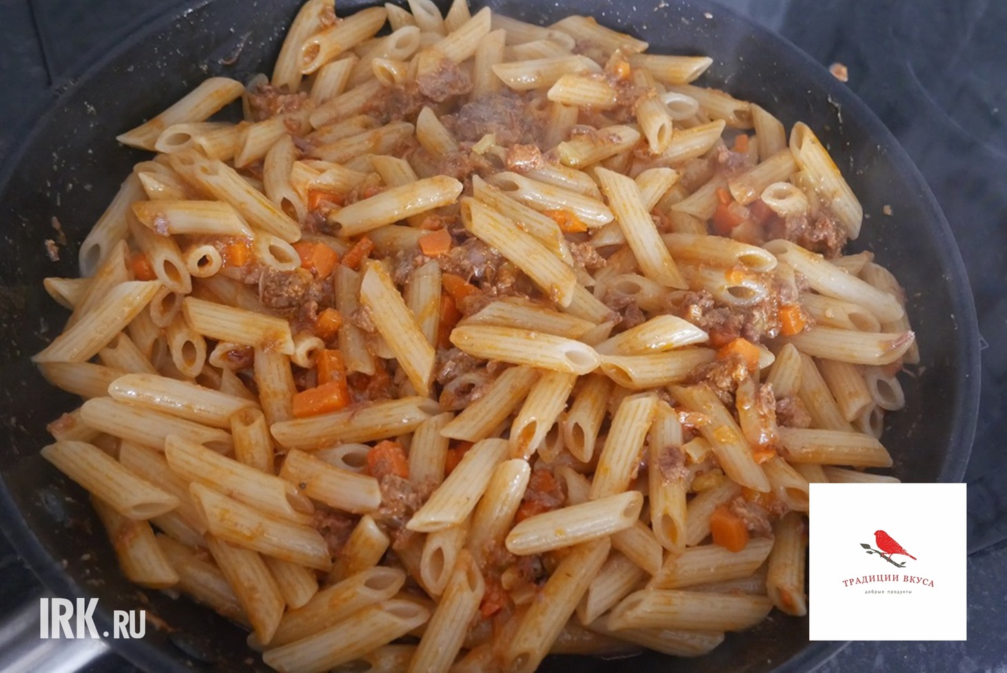 Соус готовится примерно столько же, сколько времени занимает отваривание макаронных изделий. Кстати, их тоже можно найти в белорусских магазинах «Традиции Вкуса». Для удобства кастрюлю с водой на плиту можно поставить одновременно со сковородой.