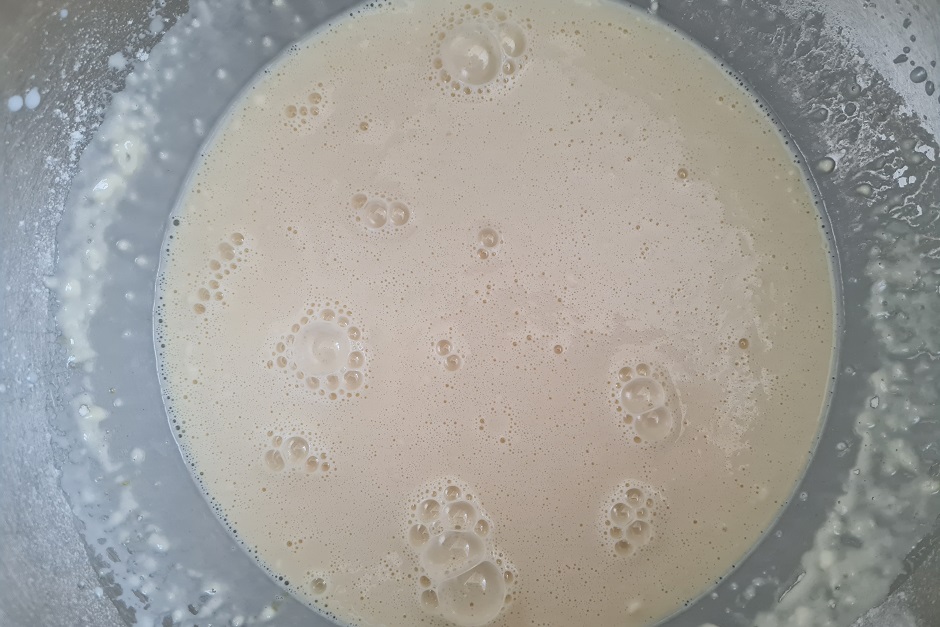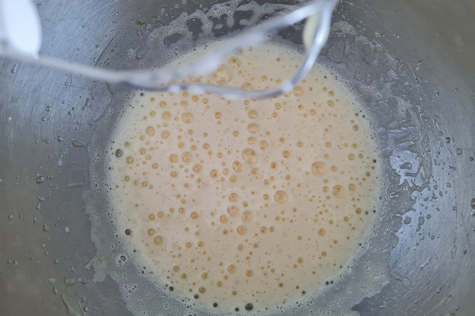 Молоко слегка подогрейте. В отдельной посуде хорошо взбейте 2 яйца с сахаром. Добавьте стакан теплого молока и снова взбейте немного. Всыпьте просеянную белую муку, продолжая взбивать.