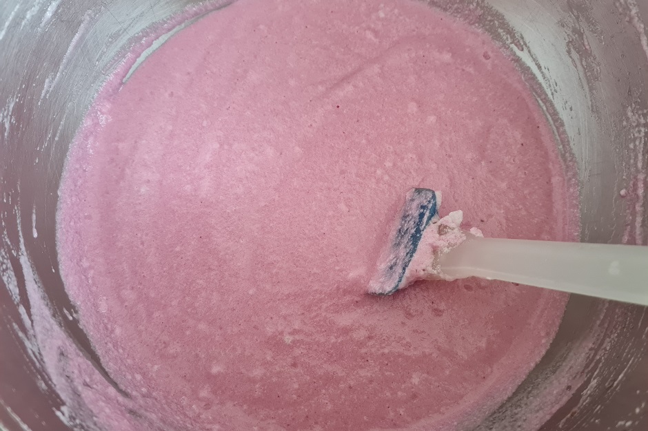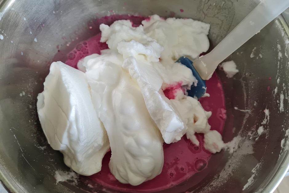 Теперь влейте оставшийся стакан молока и сок свеклы. Снова взбивайте. Когда масса станет однородной, аккуратно выложите в нее взбитые белки.