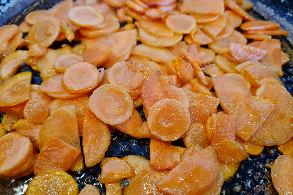 Сначала подготовим овощи. Обжарьте на растительном масле до готовности альденте (неполная мягкость) морковь, порезанную тонкими кружками и полукружиями. Это степень готовности, когда продукт сохраняет после термической обработки упругость внутри. Наша задача – обжарить все овощи так, чтобы они оставались слегка сыроватыми и похрустывали. Выложите морковь со сковороды в глубокую тарелку.