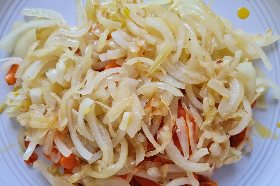 Затем нарежьте лук на четверть кольца. Тоже немного обжарьте на растительном масле и выложите на морковь в тарелку. На этом этапе можно поставить кастрюлю с водой для отваривания лапши на плиту, чтобы закипела.