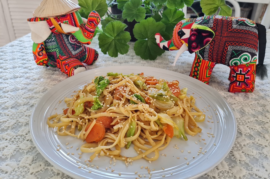 Кунжут обжарьте немного на сухой сковороде, постоянно помешивая. Обжаренный кунжут сразу уберите со сковороды в тарелку. Он должен стать слегка коричневым. Зачем жарить семена кунжута? Во-первых, полезен именно обжаренный кунжут. Во-вторых, он становится вкуснее. Можно подавать лапшу по-вьетнамски, посыпав блюдо в тарелках жареным кунжутом.