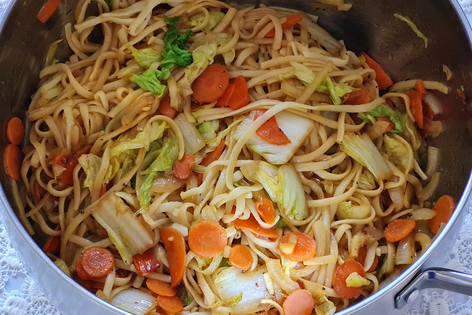 Отварите лапшу до готовности обычным способом в слегка подсоленной воде. Помните, что в блюде используем соленый соевый соус. И перед спусканием лапши в кипяток добавьте столовую ложку растительного масла — так лапша не будет слипаться. Отправьте лапшу в кастрюлю к овощам и хорошо перемешайте.