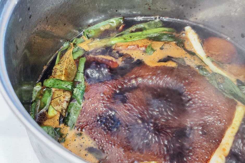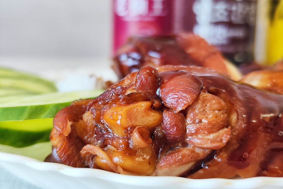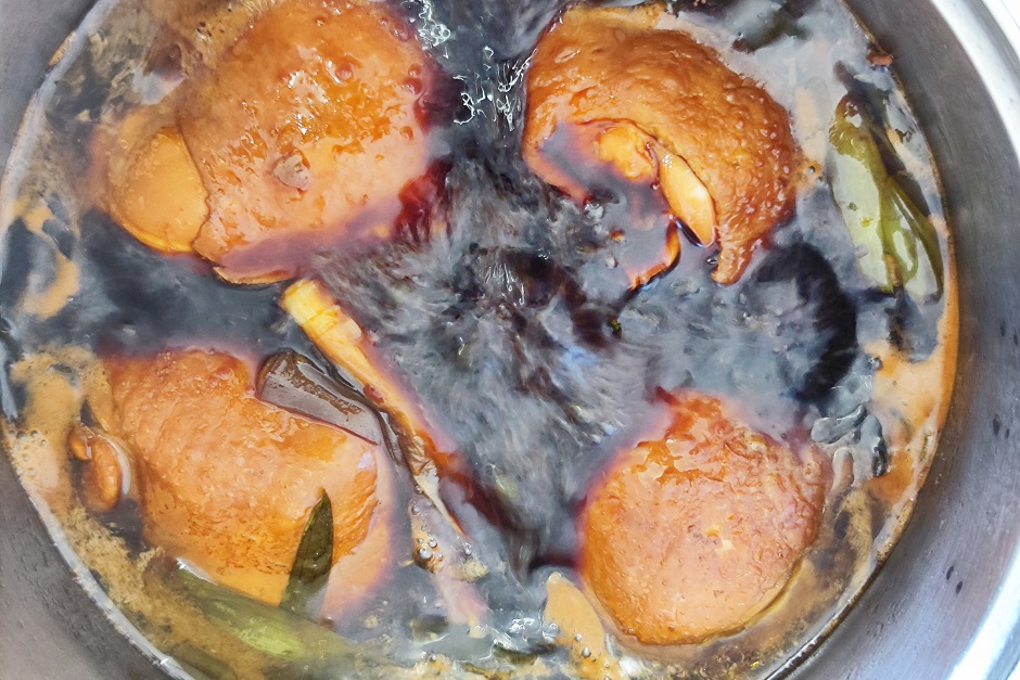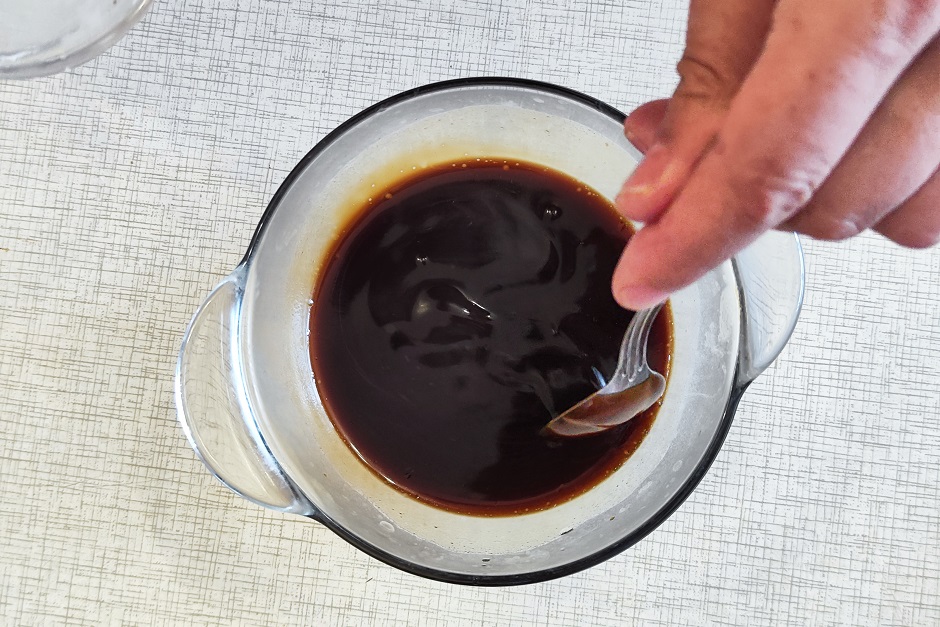 Добавляем сахар, соевые соусы, шаосинское вино, немного разбавляем водой и доводим до кипения.