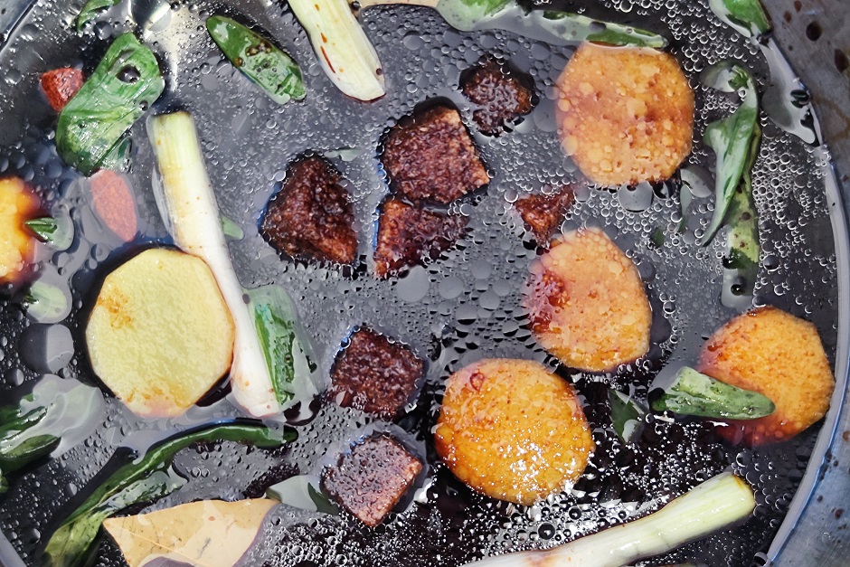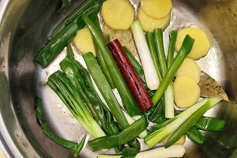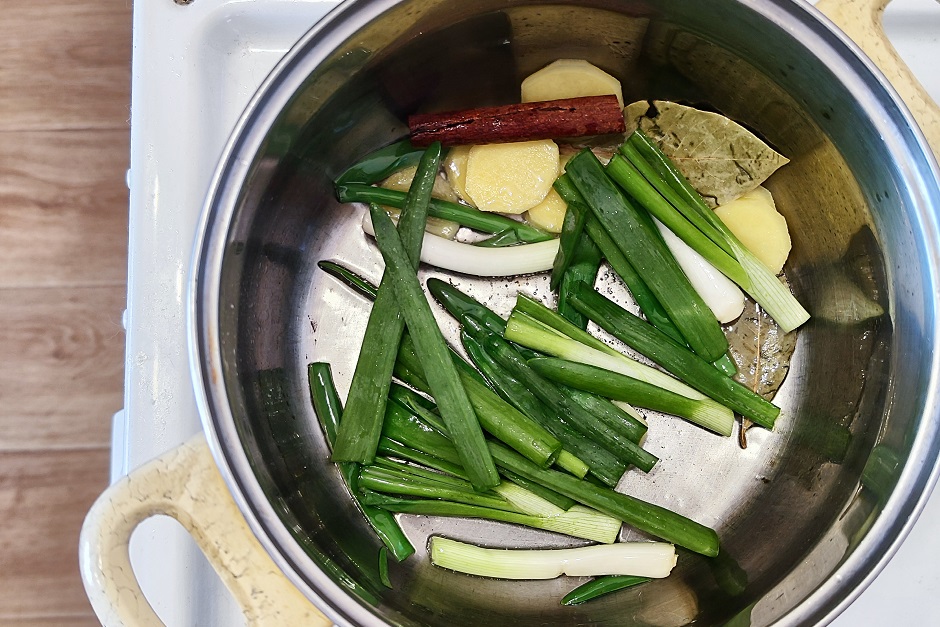 Нарезаем имбирь кружочками, а зеленый лук — крупной соломкой. В кастрюле с толстым дном на среднем огне разогреваем масло, кладем туда имбирь, лук, специи. Обжариваем, пока лук и имбирь не станут золотистыми.
