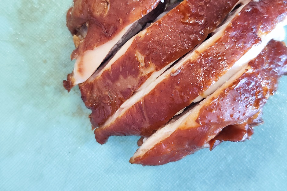 Наша курица тем временем немного остыла, и самое время порубить ее на порционные кусочки (я это сделал вместе с костями, но их можно и вынуть) и подать с рисом и свежими овощами. В нашем случае – с огурцом. Не забудьте полить соусом.