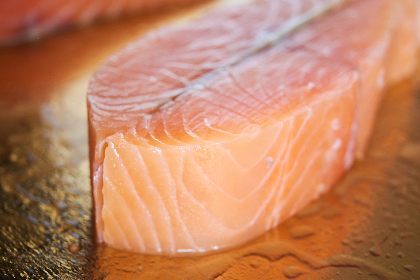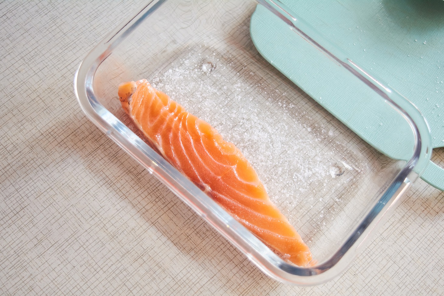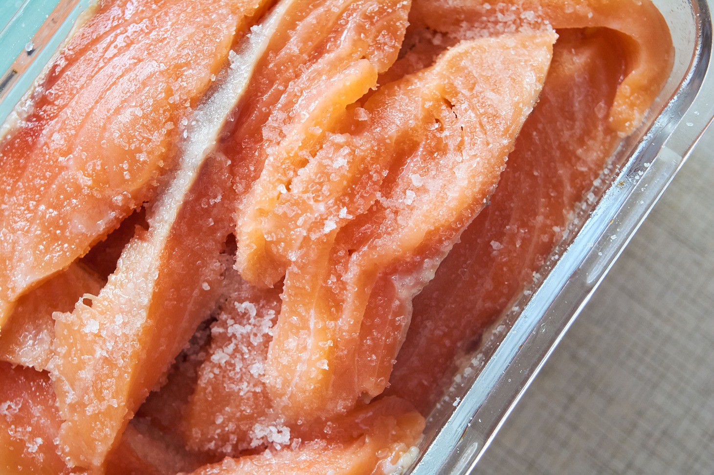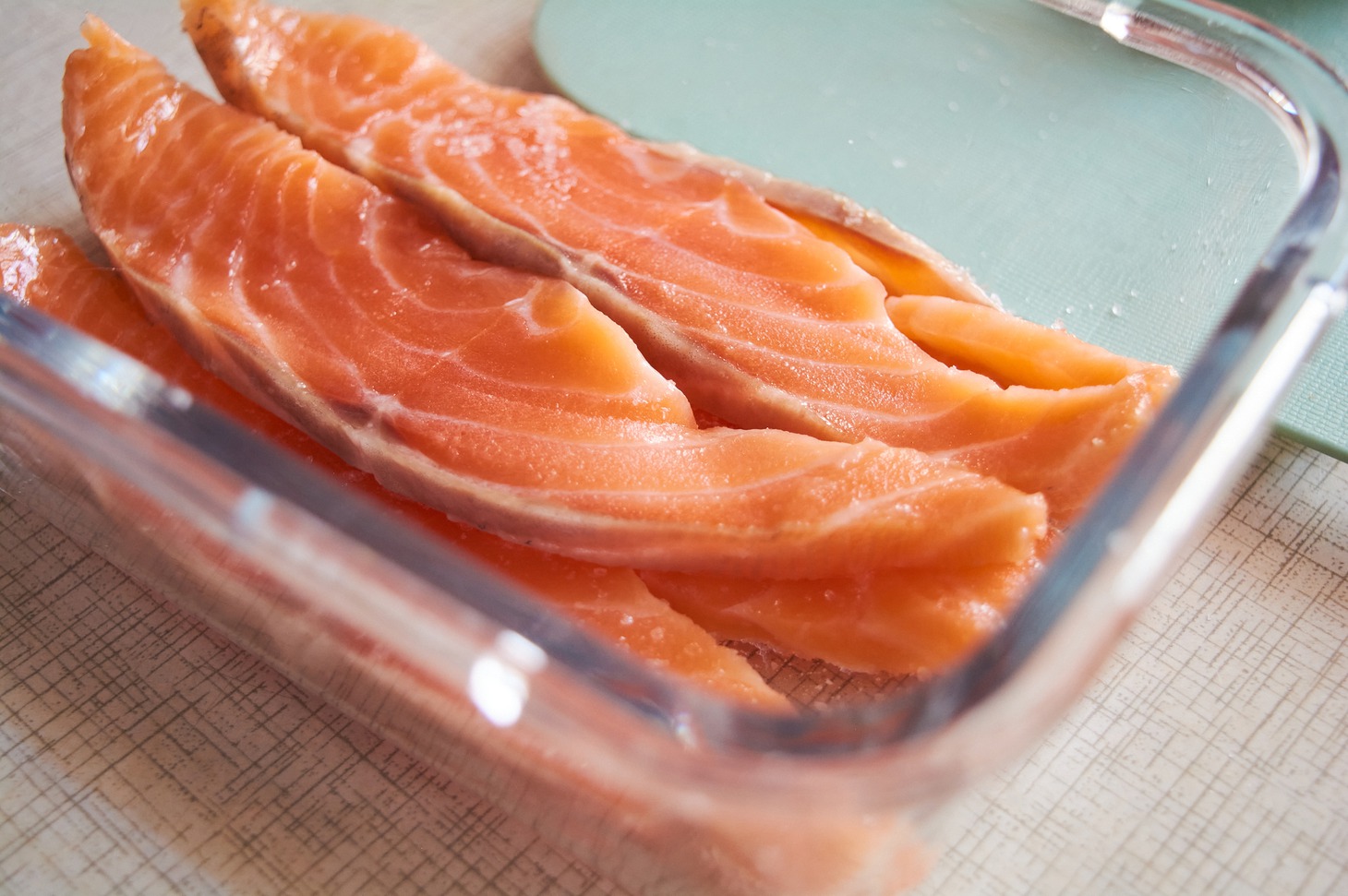Для начала разморозим рыбу. Не вынимая из упаковки оставим ее медленно оттаивать в холодильнике минимум на 8 часов, а лучше на ночь. Не надо торопиться и выкладывать рыбу на солнышко или купать в теплой воде. Структура филе после шоковой заморозки очень нежная, и резкие перепады температуры угробят нашего лосося. К тому же, при разморозке в тепле рыба теряет много влаги. Когда филе оттаяло, удаляем из него бочковые косточки и вырезаем самый красивый кусок.