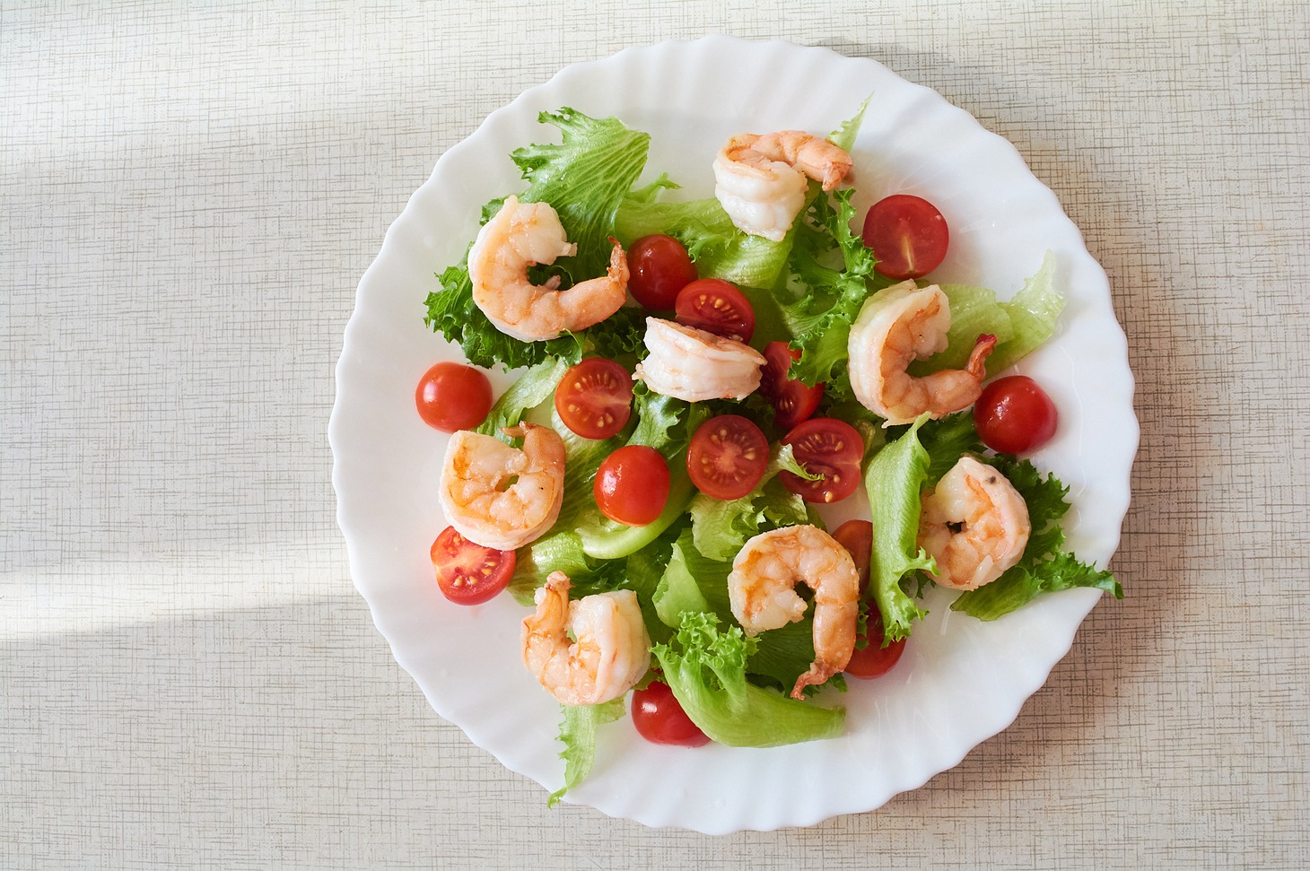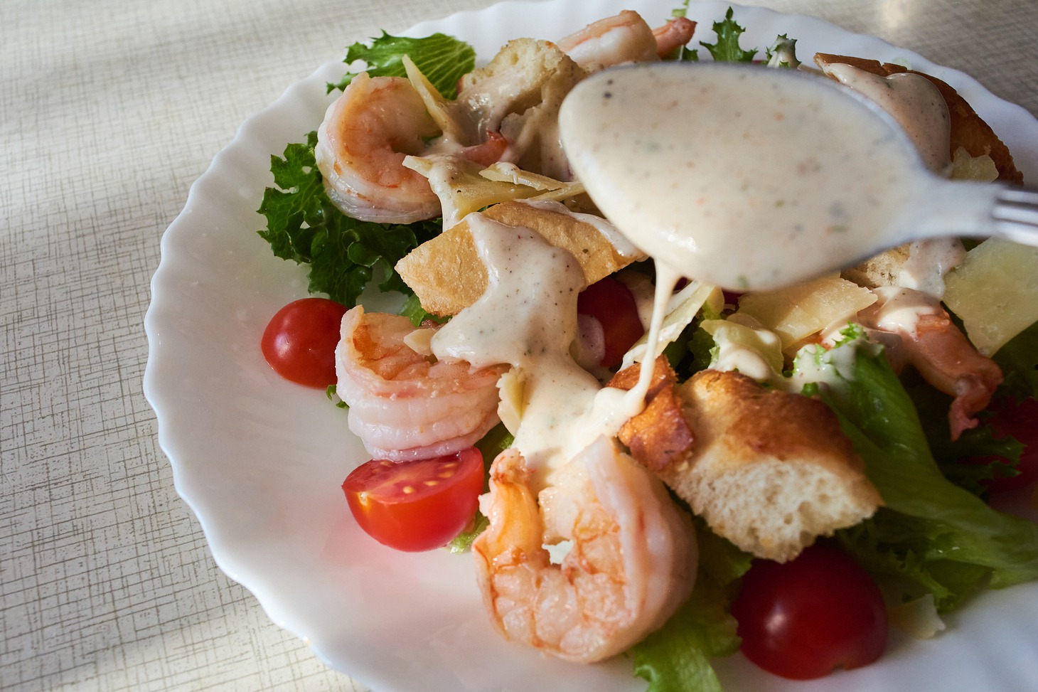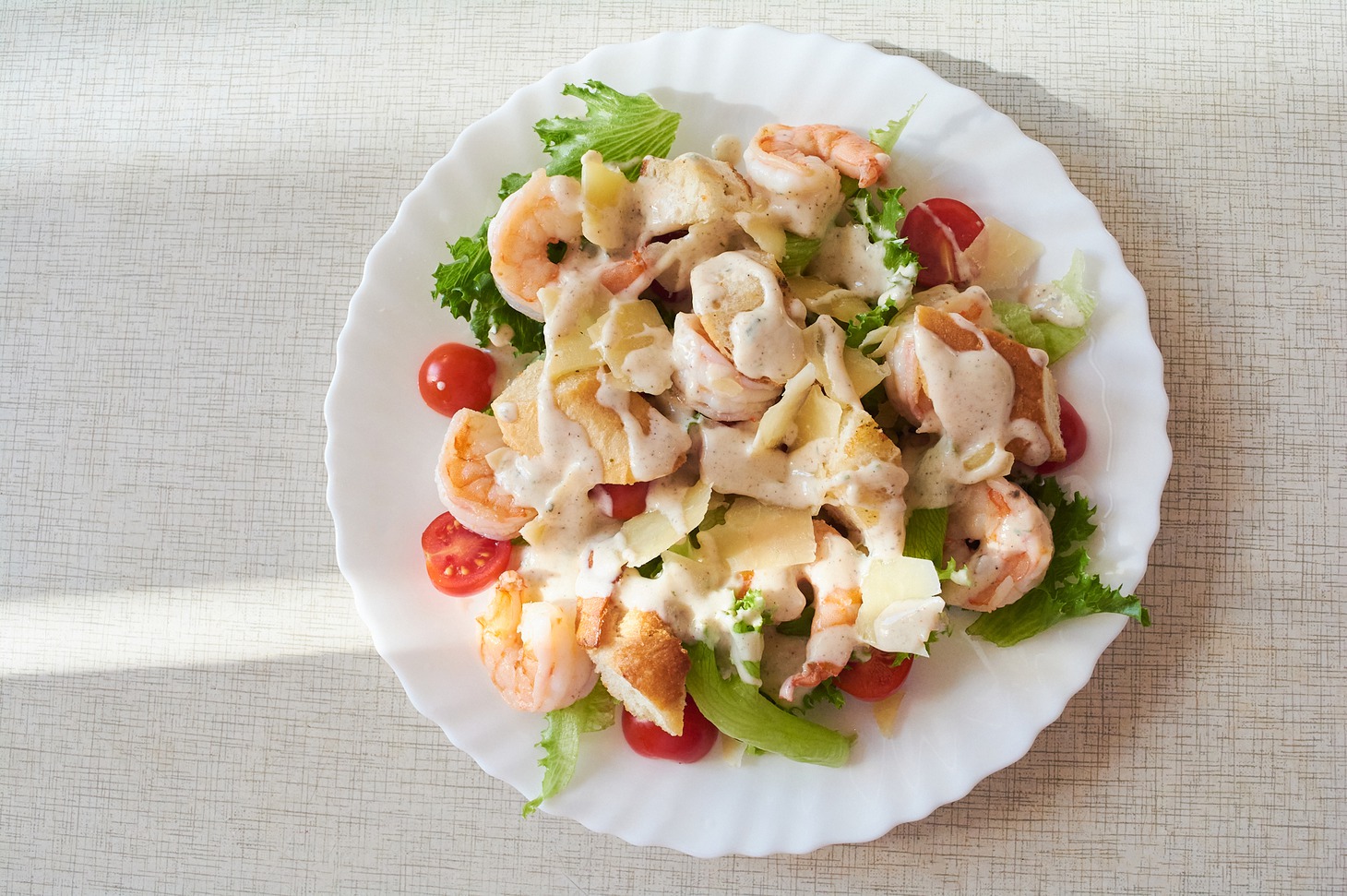 Рвем листья салата, добавляем помидоры-черри, креветки, крутоны (8 долларов, помните?) и поливаем заправкой.