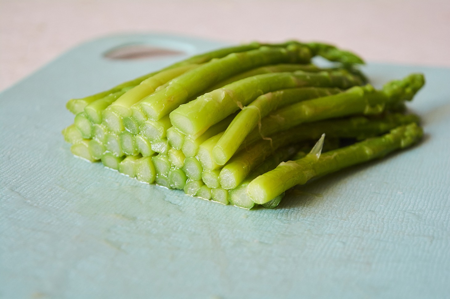 Параллельно займемся спаржей. Замороженные ростки на пару минут опустим в кипяток, а затем обрежем жесткую белую часть, оставив только нежные зеленые побеги.
