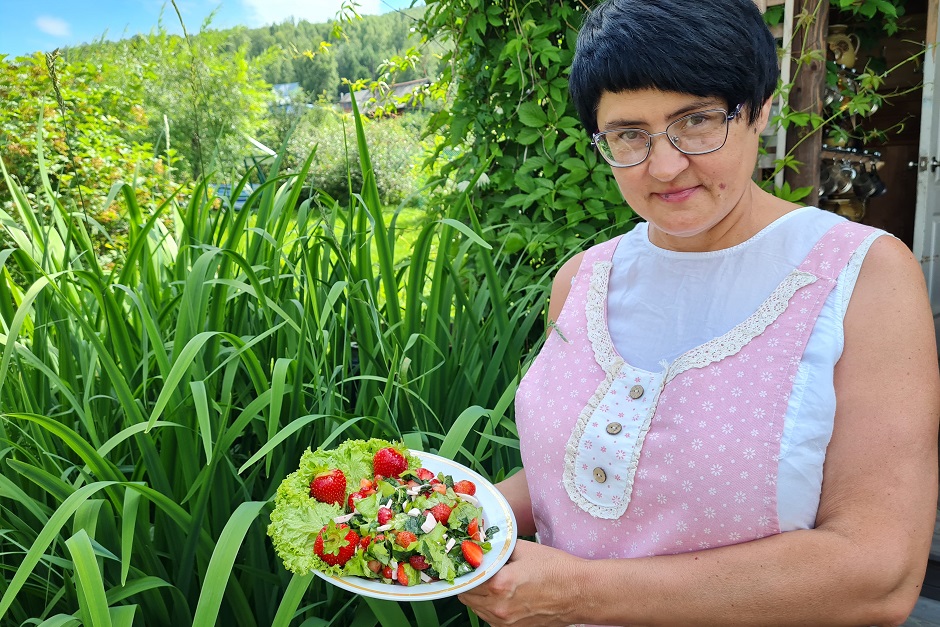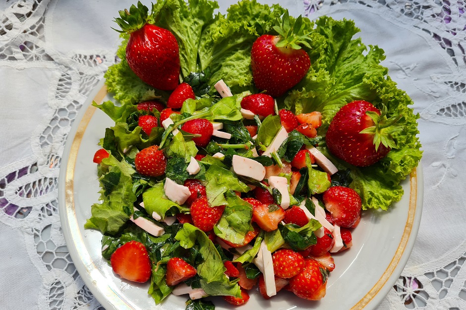 Перемешайте салат и выложите на тарелку, которую можно украсить листьями салата и клубникой. Сразу подавайте. Приятного аппетита и привет из царства клубники!