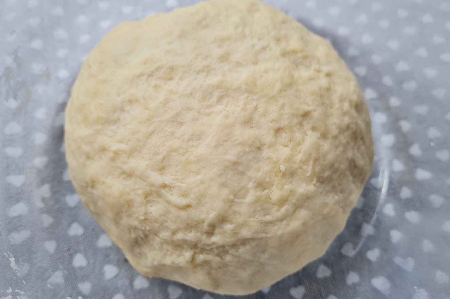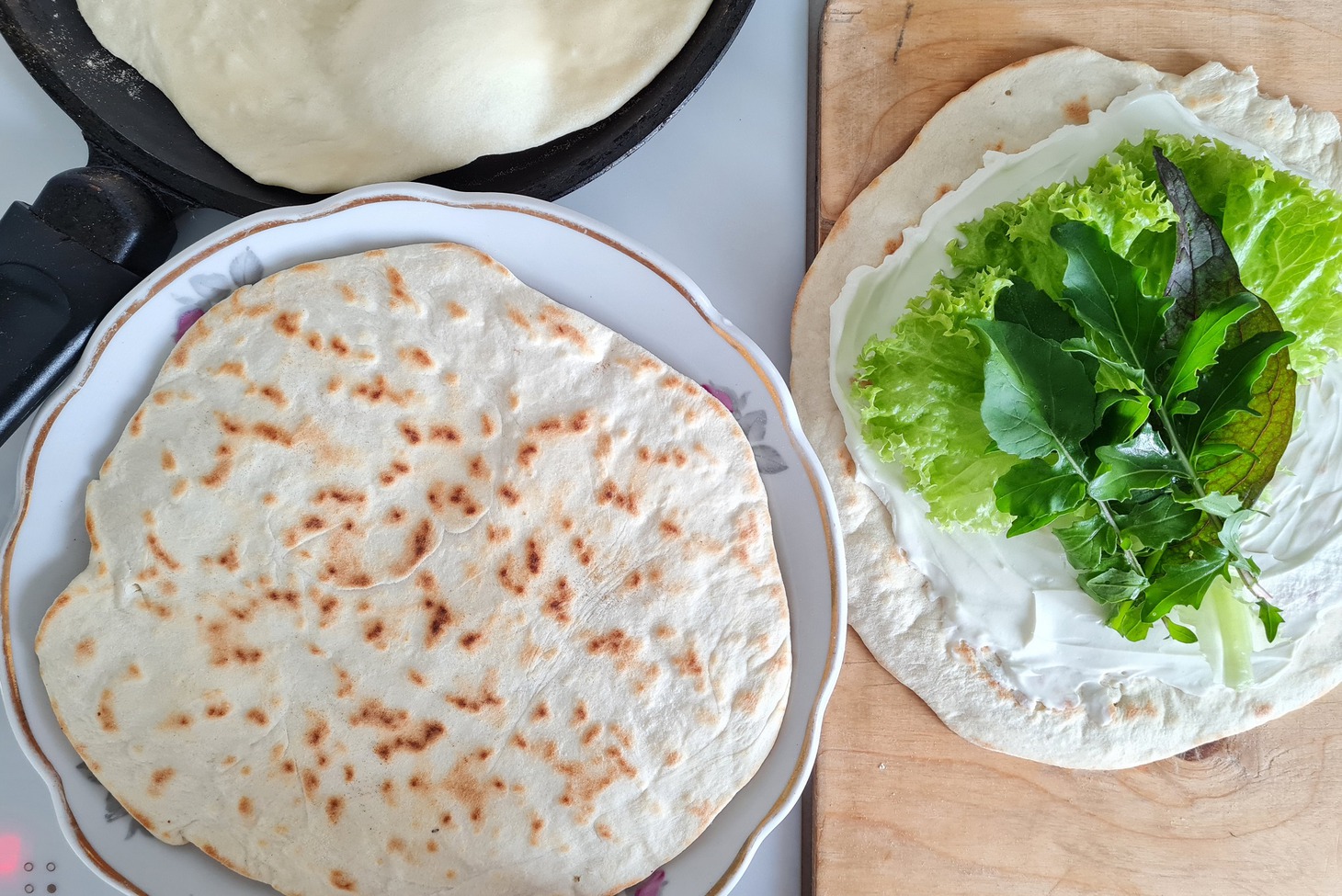 Замесите тесто. Я делаю это руками. Тесто получается достаточно тугое. Если хотите сделать лепешки более мягкие, увеличивайте количество кефира. Нам нравится сочетание именно хрустящих лепешек с овощами и творожным сыром.