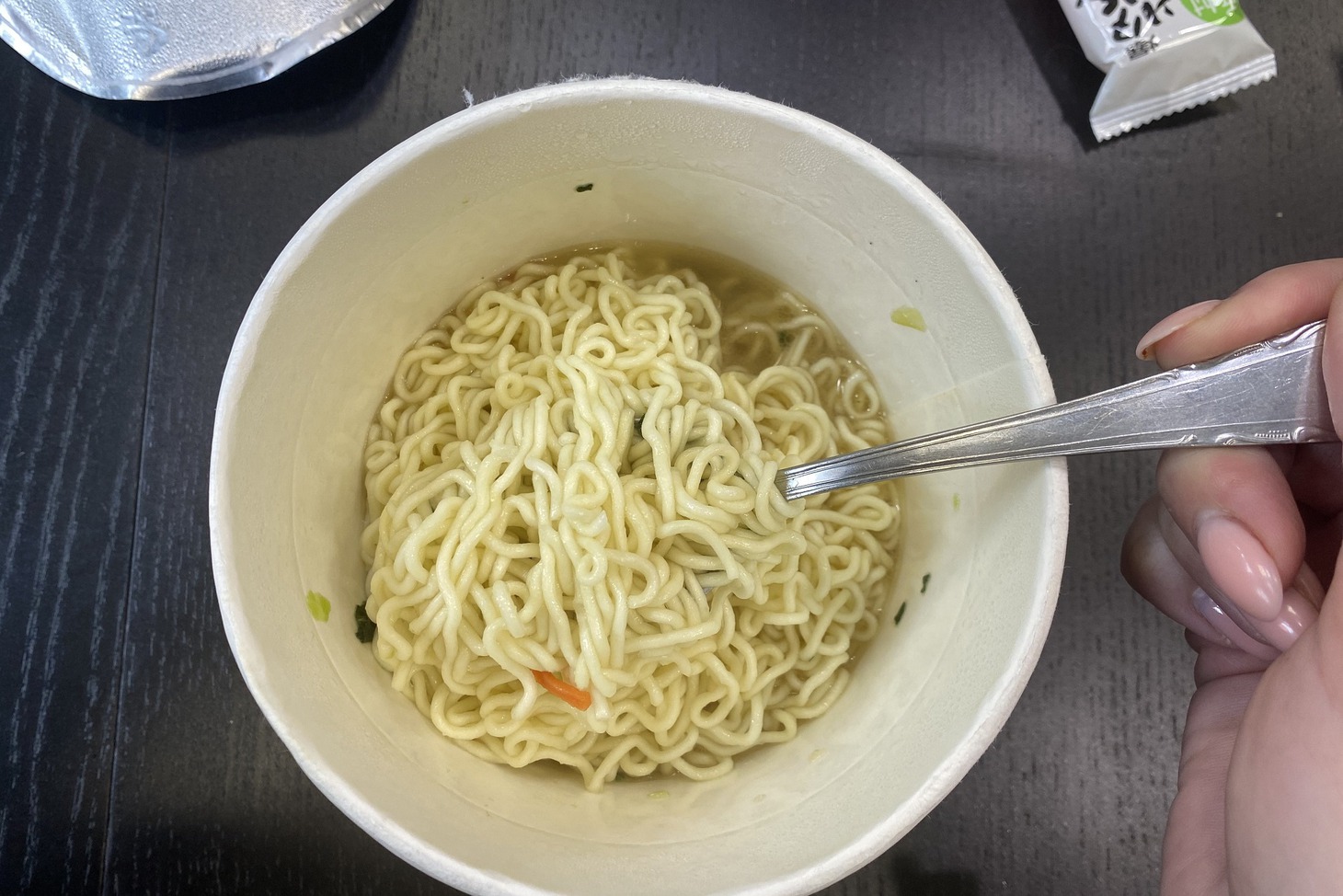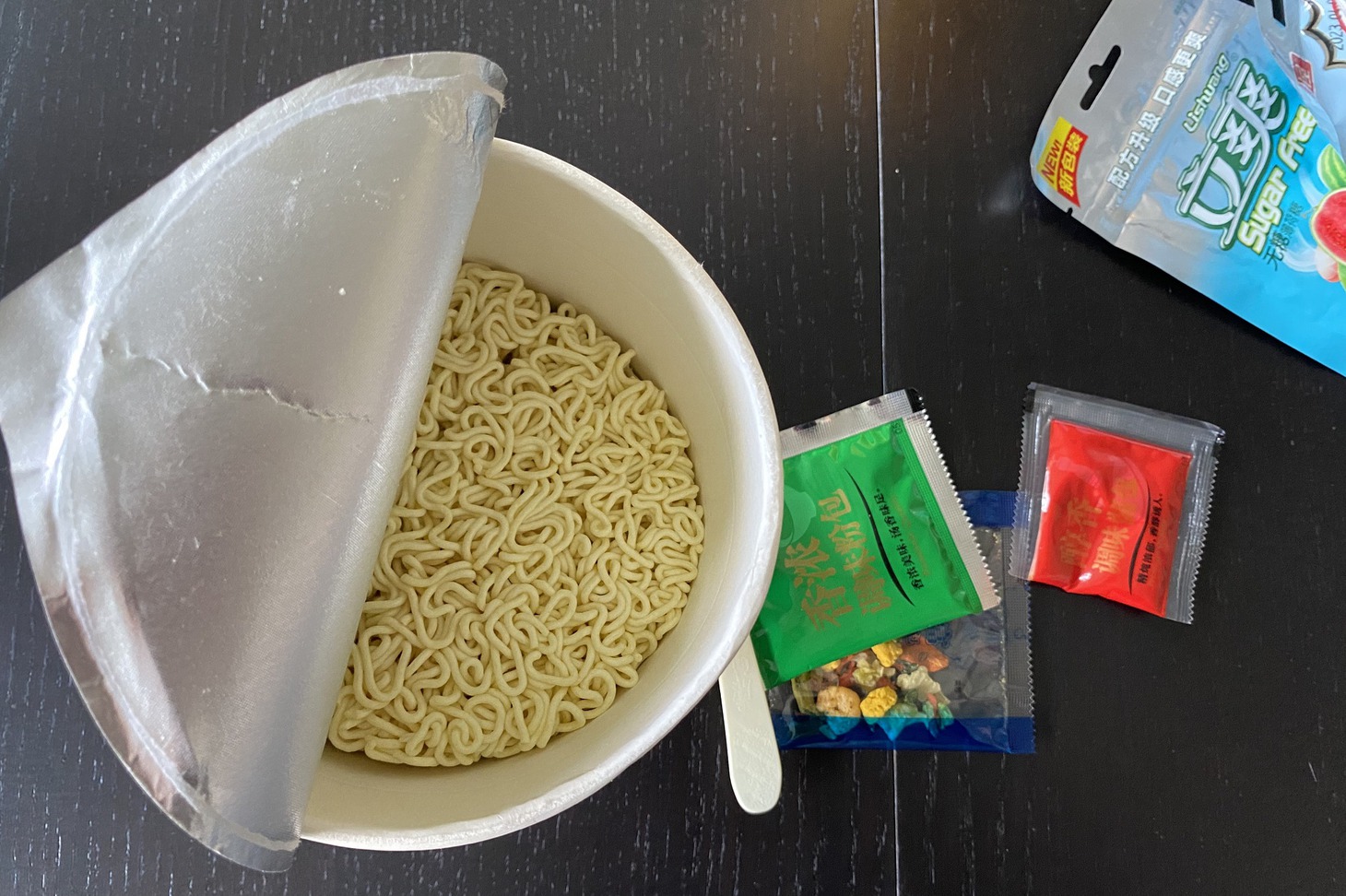 Чего тут только не было: лапша острая и неострая, соевое мясо на шпажках, соевое мясо со специями, пирожные моти, фруктовый сок с необычным молочным привкусом, чипсы, кисло-сладкие конфеты… Начали с главного — лапши.