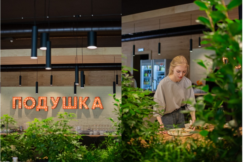Главной задачей при ремонте было не меняться кардинально, ведь у «Подушки» много постоянных клиентов, которые привыкли к обстановке любимого заведения. Поэтому зонирование осталось тем же, но в интерьер добавили много дерева, зелени и живых цветов. Все выдержано в однотонной, спокойной гамме. Этот дизайн не потеряет актуальности и через два-три года.