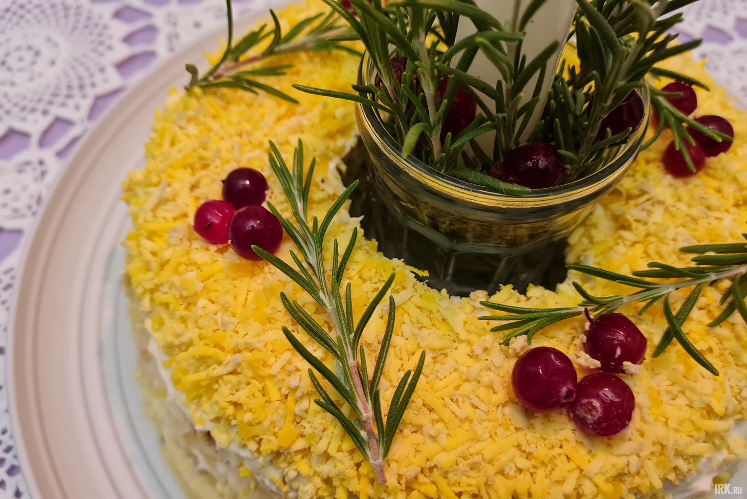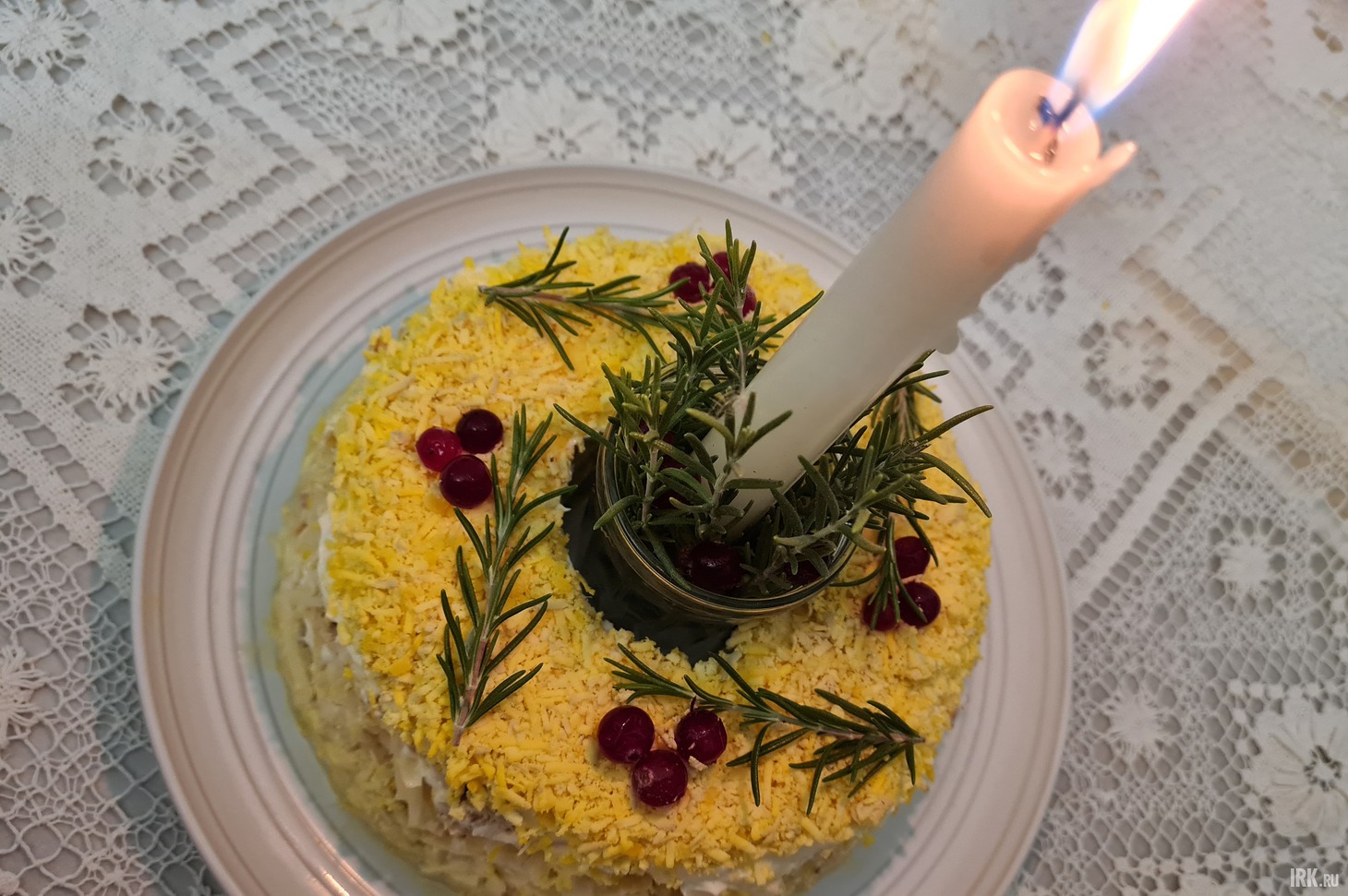 Если речь уже зашла о подготовке к Новому году, покажу, как можно украсить салат совсем по-новогоднему. Вместо удалённого гранёного стакана я поставила небольшую баночку в виде стаканчика, установила в неё свечу, предварительно накапав немного горячего парафина на дно баночки, чтобы свеча приклеилась. Не хотите пачкать баночку парафином – застелите её дно кусочком фольги. Вместо баночки можно использовать гильзу от чайной свечи, рюмку. Затем я поставила вокруг свечи веточки розмарина и положила клюкву.