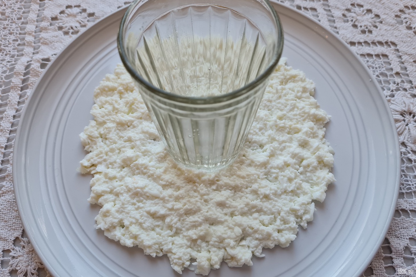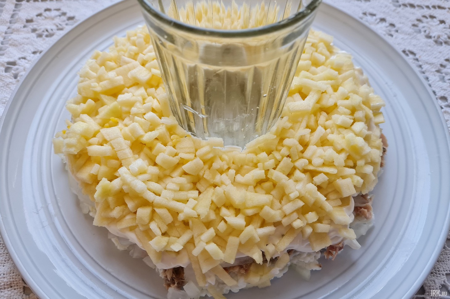 Салат делаем слоями. Можно просто укладывать на тарелку, а можно поставить посередине стакан и укладывать ингредиенты вокруг него. Так салат выглядит более интересно. Первый слой — варёный белок яйца, измельчённый с помощью тёрки. Укладывайте его кольцом, ширина которого примерно 6-7 сантиметров. Салат должен получиться нежным, воздушным, поэтому все слои укладывайте, не утрамбовывая.