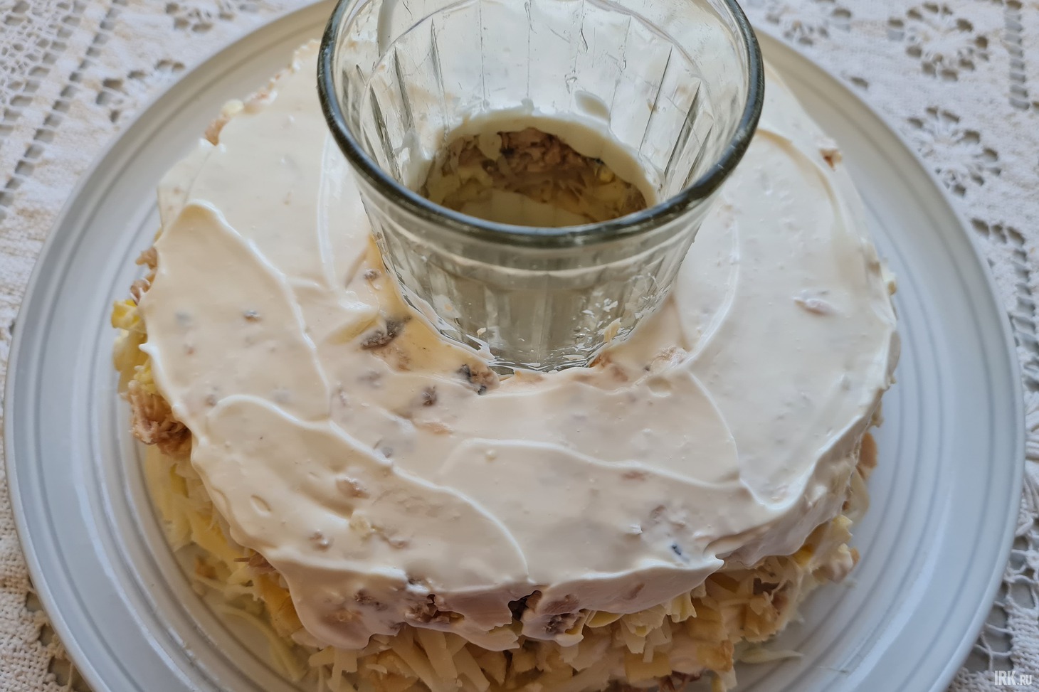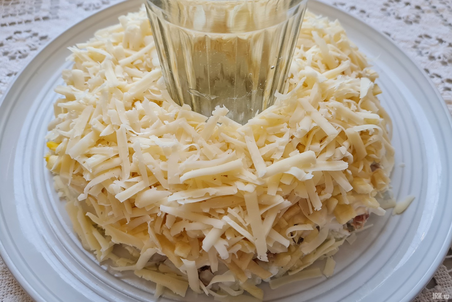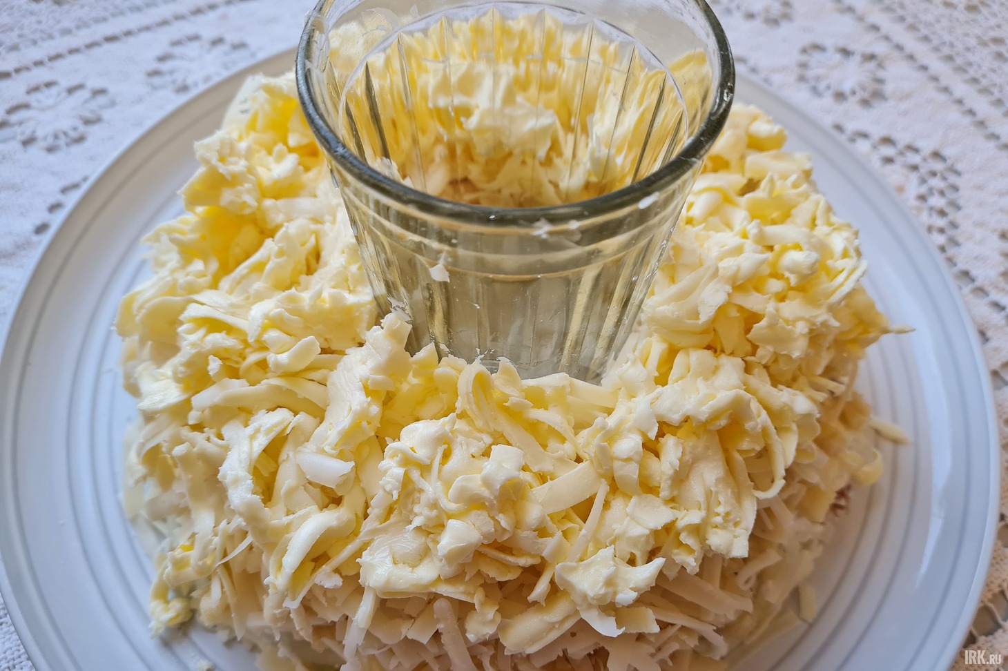 Десятым слоем посыпаем салат желтком яйца. Здесь берём мелкую тёрку. Широким ножом, шпателем или лопаткой кулинарной выровняйте края салата. Уберите аккуратно стакан.