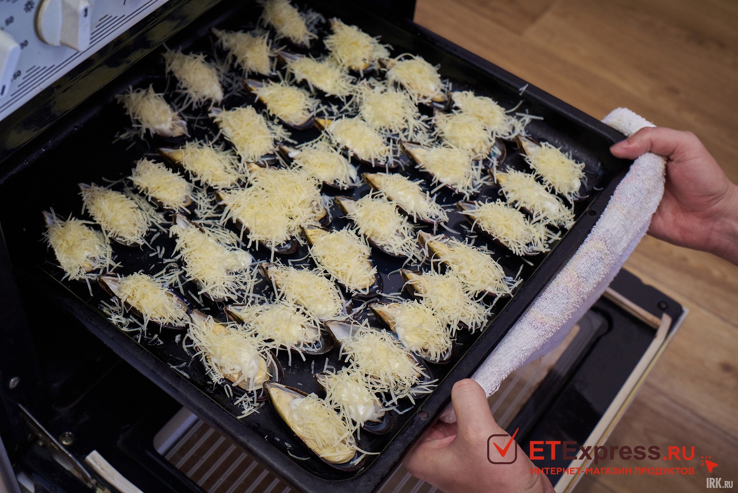 А пока утка печется (спойлер: это займет еще час), мы приготовим мидии. Промоем их под холодной водой и разложим на противне.