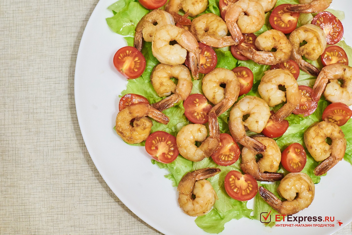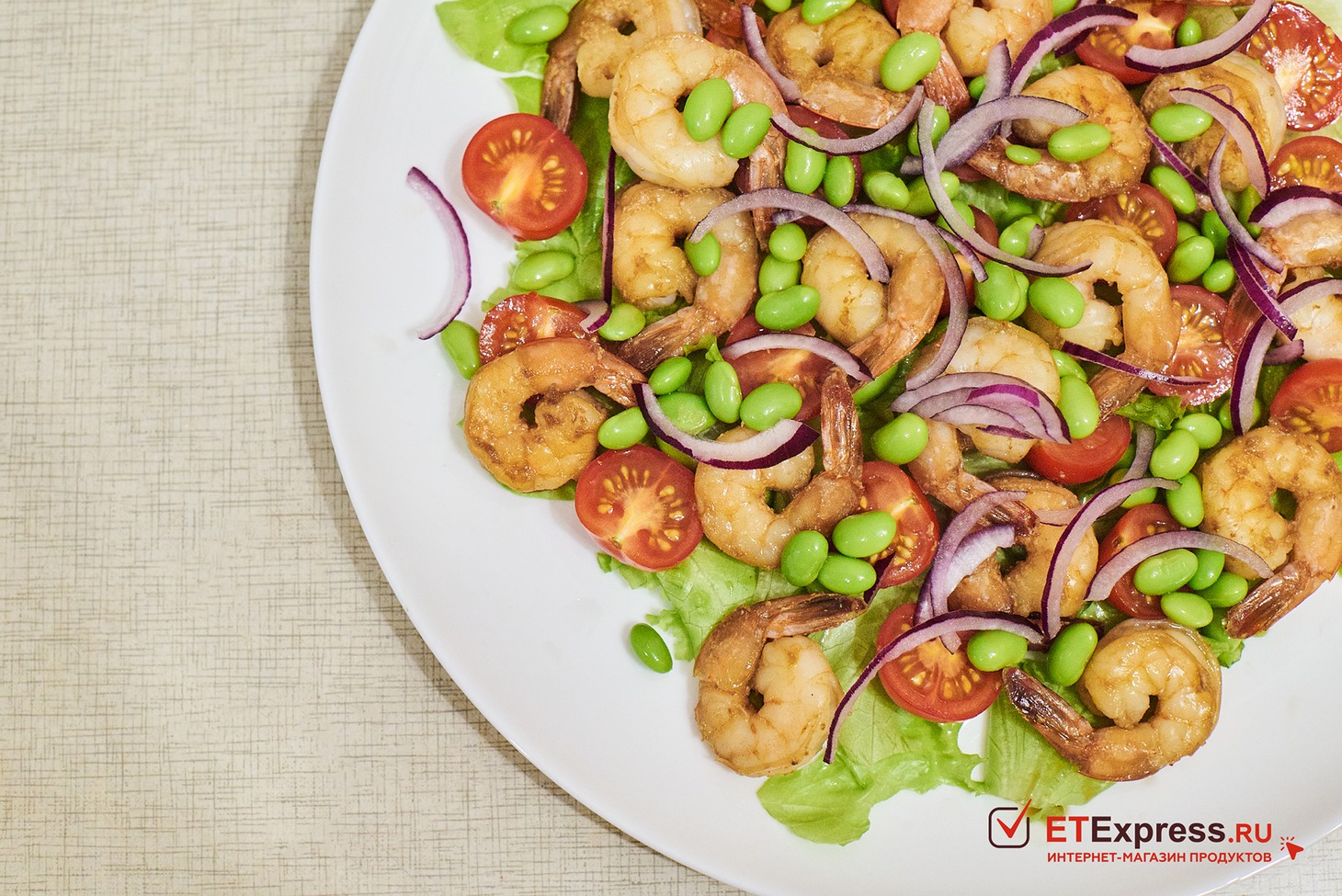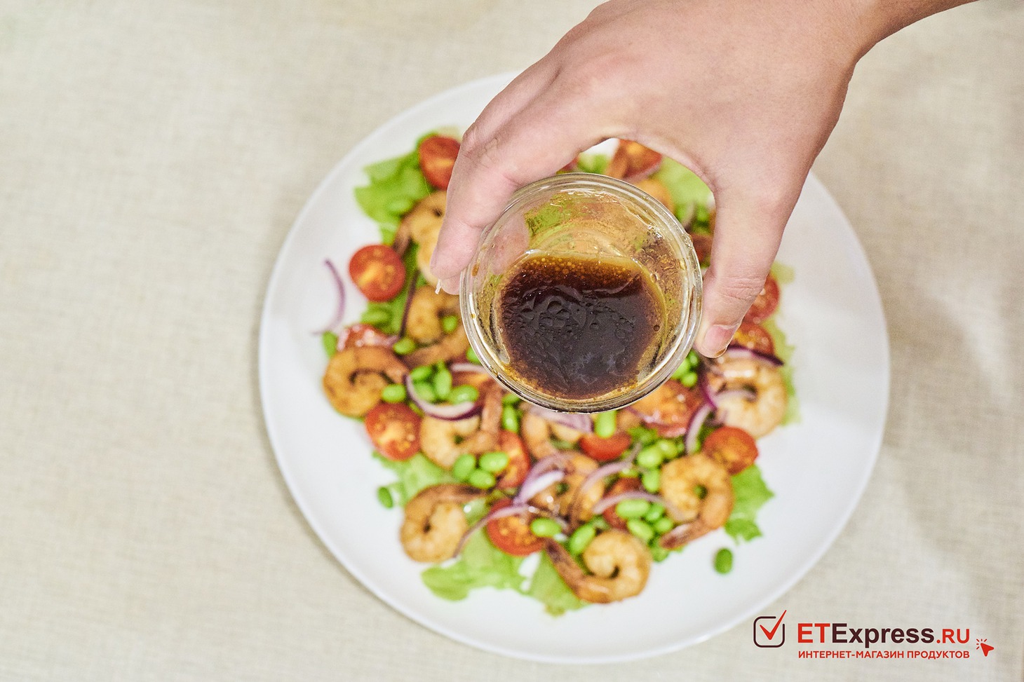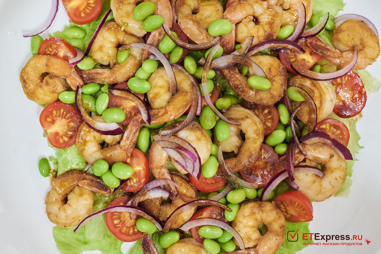 Собираем наш салат: выкладываем листья салата, помидорки черри, креветки, бобы, красный лук. Заправляем смесью растительного масла, соевого и устричного соусов и лаймового сока.