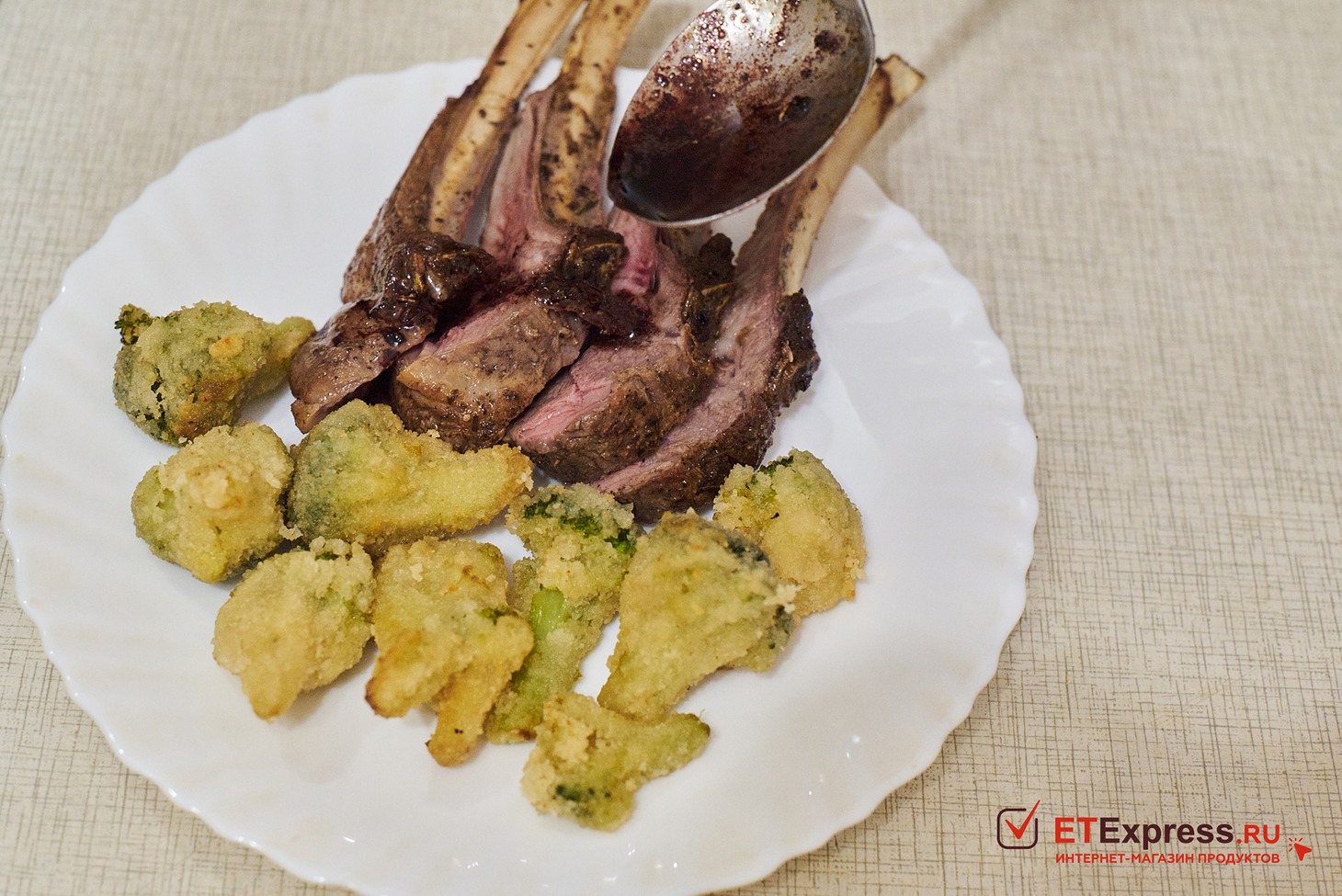 Все готово, можно подавать: нарезаем ягнятину, поливаем соусом, рядом выкладываем крокеты из брокколи. На самом деле, если не фотографировать каждый шаг, на все про все уходит значительно меньше часа. Вспоминаем, сколько времени уходит на сельдь под шубой и, кажется, выбор очевиден!
