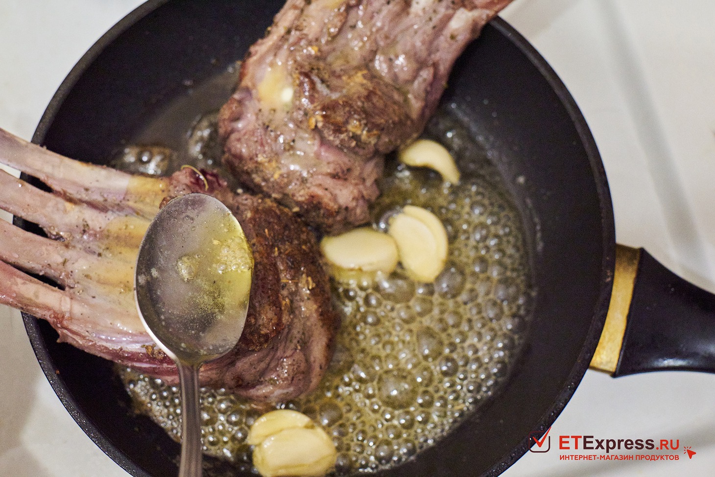 Уменьшаем огонь до среднего, добавляем в сковородку сливочное масло и три зубчика чеснока. Вооружаемся ложкой и активно поливаем нашего ягненка растопленным маслом, периодически переворачивая. В зависимости от желаемой степени прожарки это развлечение будет продолжаться 10-15 минут. Мы хотели получить «медиум», поэтому уложились за 12. Конечно, многое зависит от конкретной плиты и толщины куска мяса.