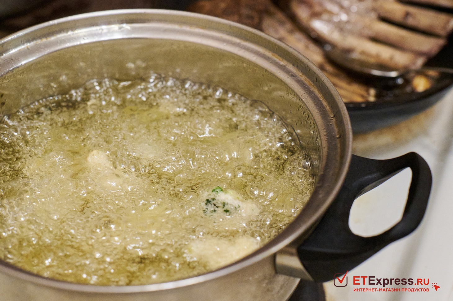 Кстати, параллельно можно приготовить гарнир: разогреваем растительное масло в кастрюльке до 160 градусов. Если под рукой нет специального термометра, просто опустите туда деревянную палочку: если она покроется пузырьками, значит, температура, что надо. Когда масло разогрелось, вдумчиво читаем рецепт на упаковке крокетов: опустить в горячее масло и обжарить три-пять минут, не перемешивая. Так и поступим. А потом чуть обсушим на бумажном полотенце или в дуршлаге.