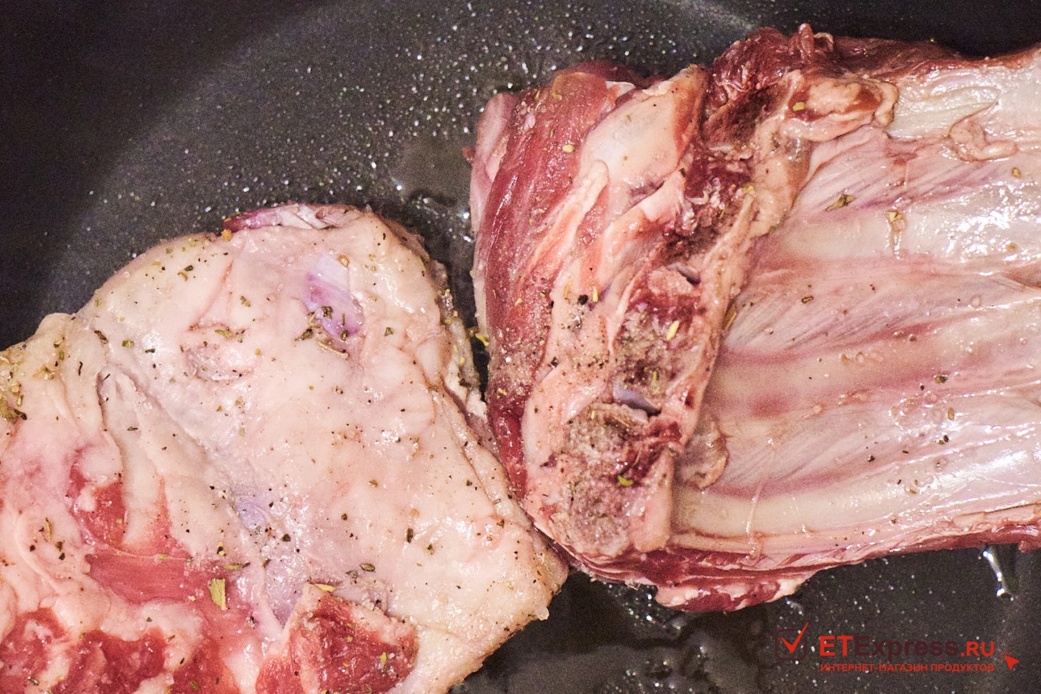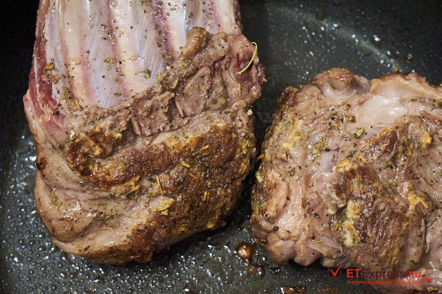 Разогреваем сковороду и выкладываем туда ягнятину мясистой частью вниз. Обжариваем пару минут, потом по минуте с «торцов» и две минуты со стороны косточек. В принципе, после этого можно переложить каре в разогретую до 180 градусов духовку и довести до готовности, а можно доготовить прямо в сковороде.