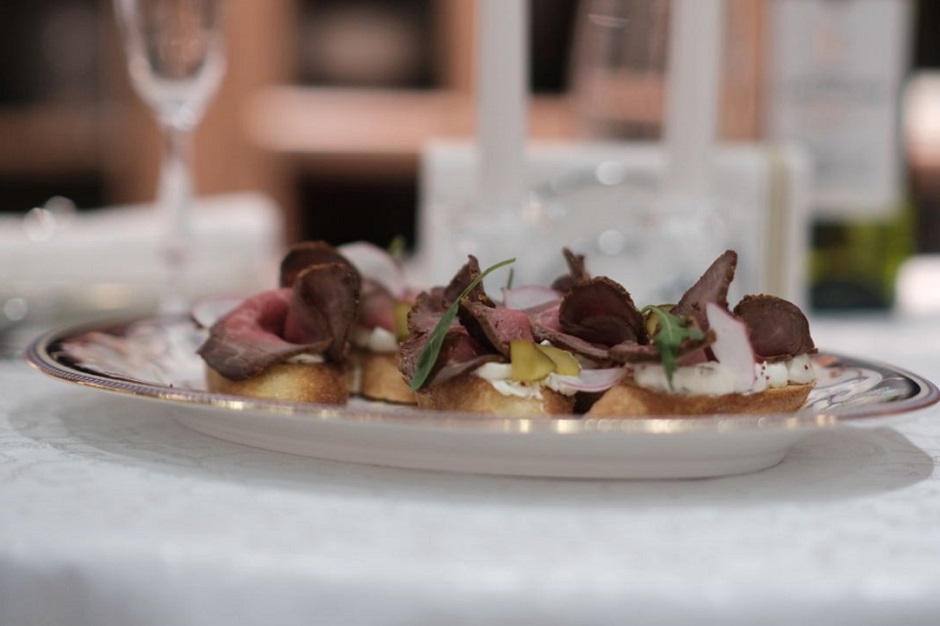 Как только заветные цифры достигнуты, достаем ростбиф из духовки, смазываем зернистой (это важно, не перепутайте с ядреной русской) горчицей, посыпаем специями и ждем, пока вся эта красота остынет. А дальше следуем указаниям из видео: режем мясо тонкими слайсами, выкладываем на брускетты и добавляем в салат.
