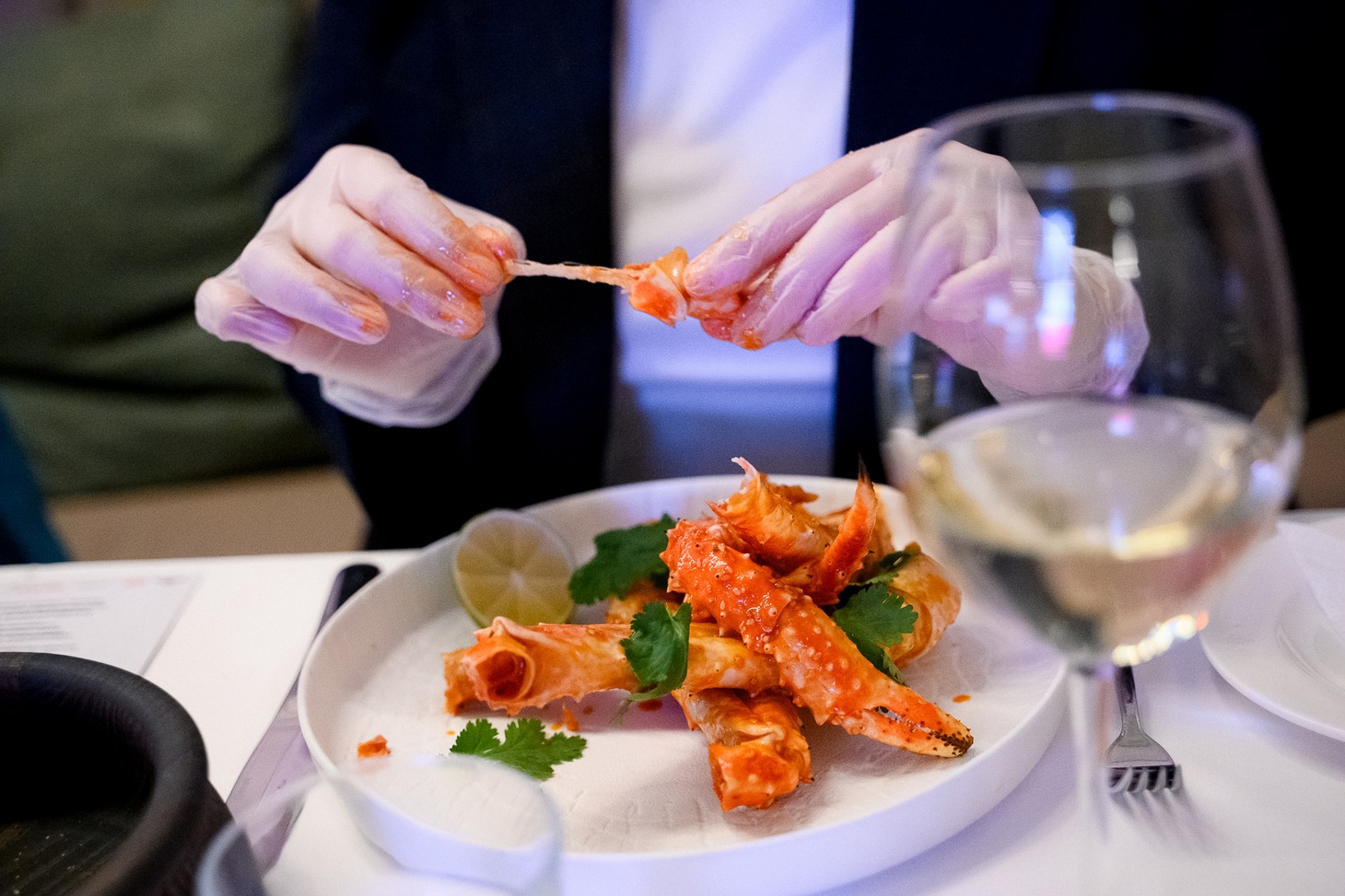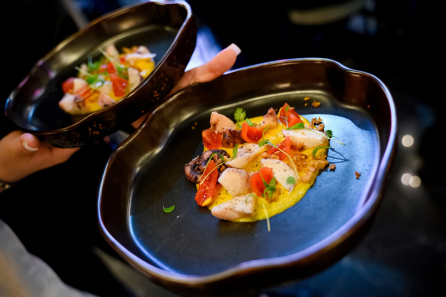 Гостям вечера представили меню из 6 курсов: осьминог с перечным соусом кимчи, приморской гребешок с клубникой и соусом манго, подкопчённый палтус, краб. Шоковая заморозка позволила сохранить морепродукты в свежем виде, а уникальная рецептура и умелые руки поваров превратили их в кулинарные шедевры. Каждая подача сопровождалась напитками от гастрономического клуба Gusto***.