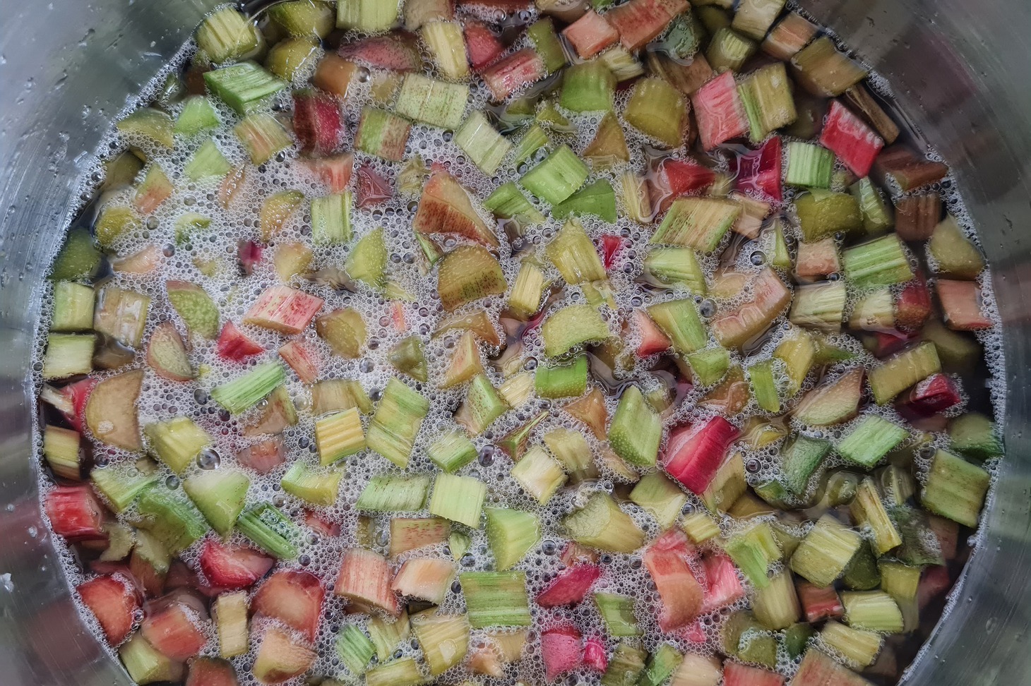 Как только выделится сок, нагрейте все до кипения и варите на небольшом огне минут 10. Добавьте нарезанные бананы и варите снова до полной мягкости ревеня. Много времени это не займёт, точно не больше 5 минут. Хотя время варки будет зависеть от возраста черешков ревеня.