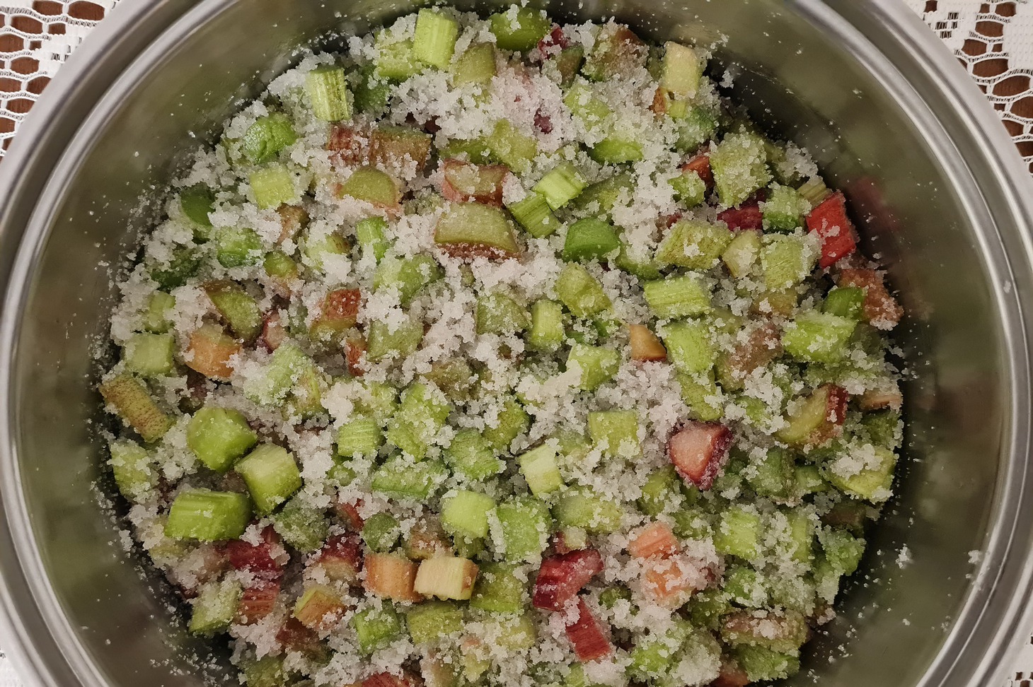 Может возникнуть вопрос, нужно ли чистить черешки ревеня от кожицы. Я не очищаю, так как у нас даже в августе не бывает старого ревеня. Чтобы куст оставался всё лето молодым, мы не даём ему цвести, удаляя соцветия, и постоянно что-то готовим из ревеня. У него просто вырастают новые черешки. Если они старые, очистите от кожицы и уже после этого отвесьте один килограмм.
