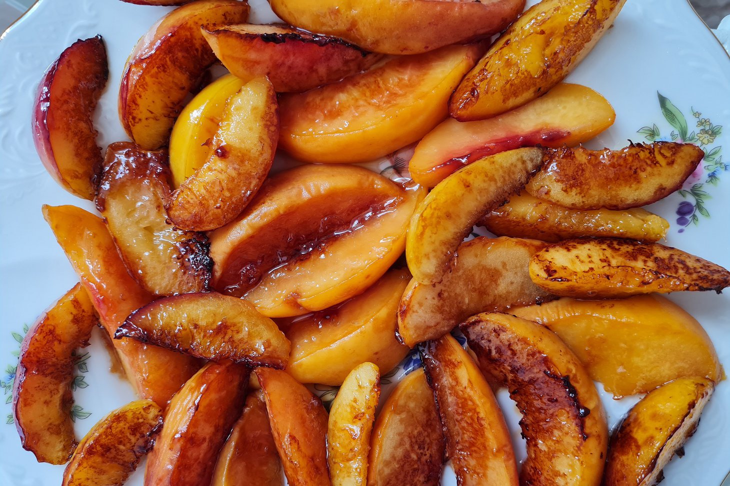 Сначала будем жарить персики (нектарины). На сковороде растопите сливочное масло и мёд. Фрукты нарежьте небольшими дольками и обжарьте с двух сторон до появления карамельной корочки. Выложите на тарелку и оставьте остывать. Оставшееся масло со сковороды не выливайте — оно пригодится.