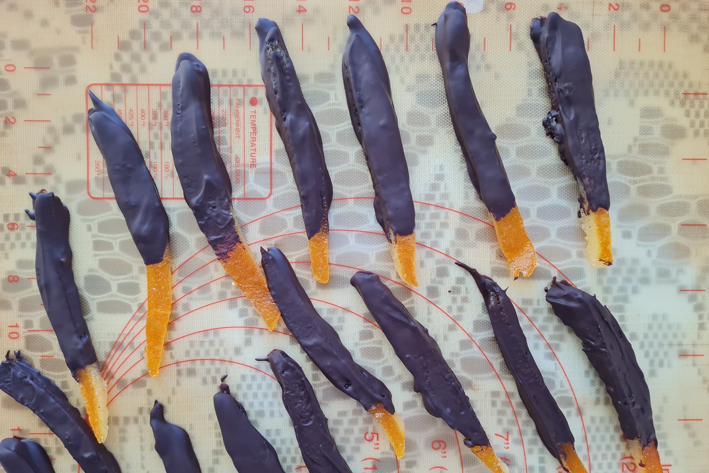 Нарежьте корки длинными полосками вдоль. Длинные удобнее обмакивать в растопленный шоколад, если вы захотите это сделать.