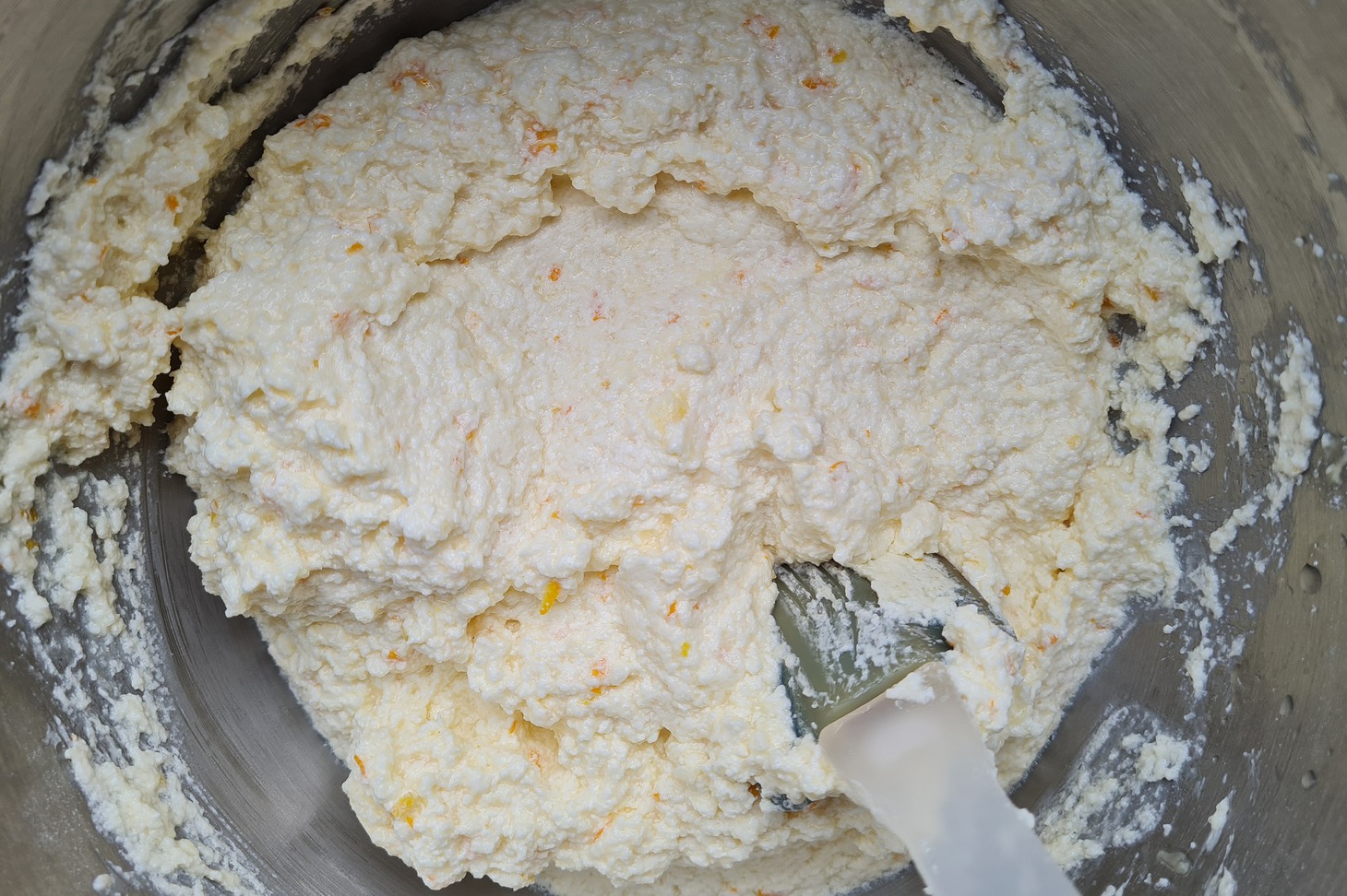 Творог 5 % протрите через сито или хорошо потолките. Если он мелкозернистый, этого делать не нужно. Сухой творог не подойдёт для штоллена. Чаще подходящий (сырой и мелкозернистый) бывает в пачках.