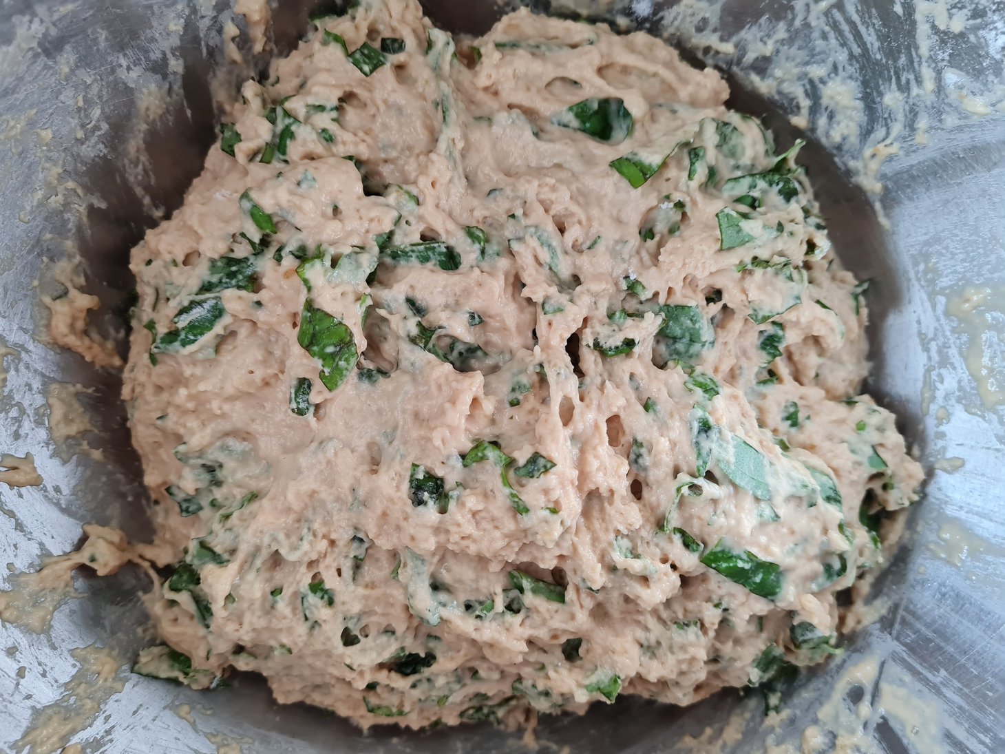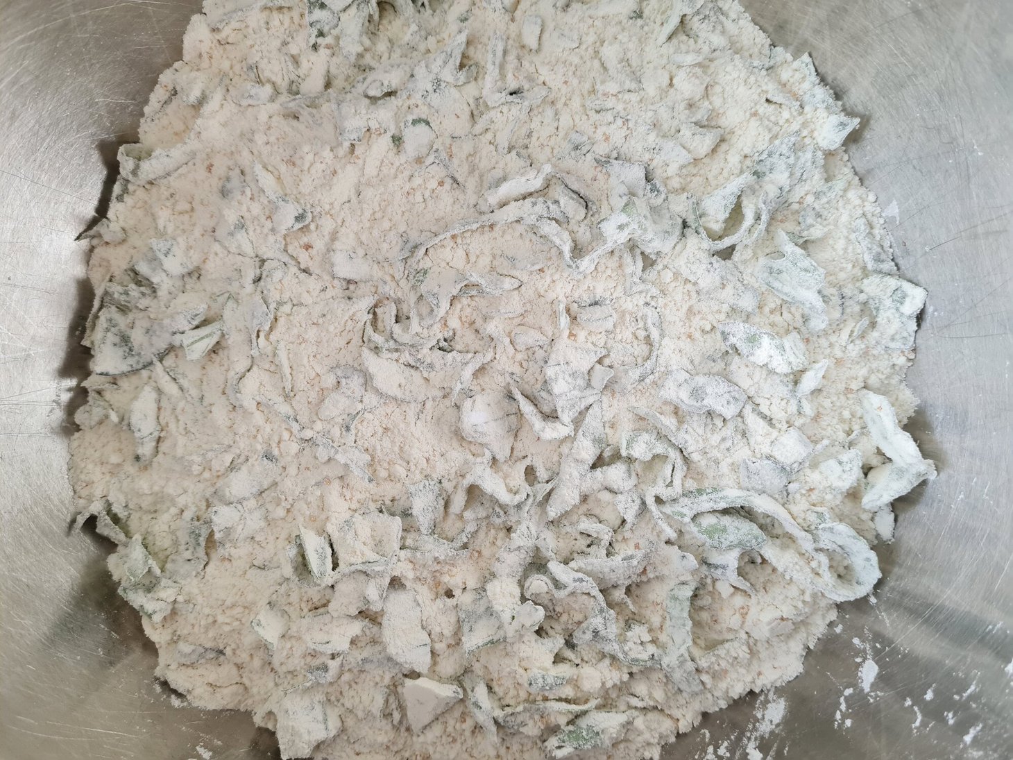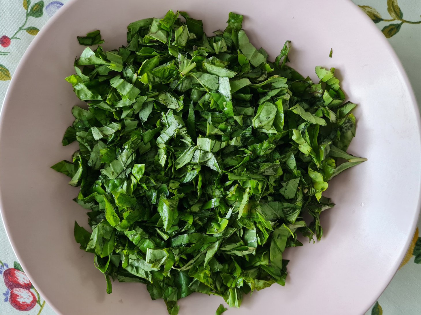 В тесте не используются веточки и цветы, только листья. Их нужно сначала взвесить, а потом помыть, чтобы точно следовать рецепту. Затем промокните листья полотенцем, удаляя лишнюю влагу, и мелко нарежьте.
