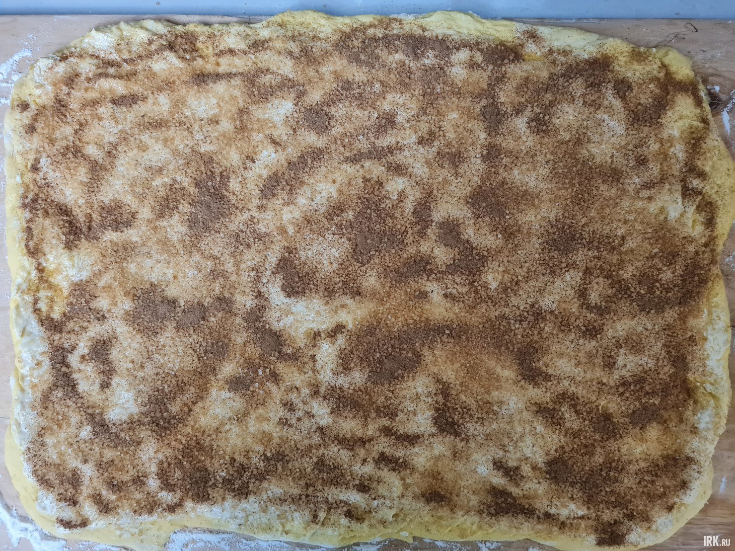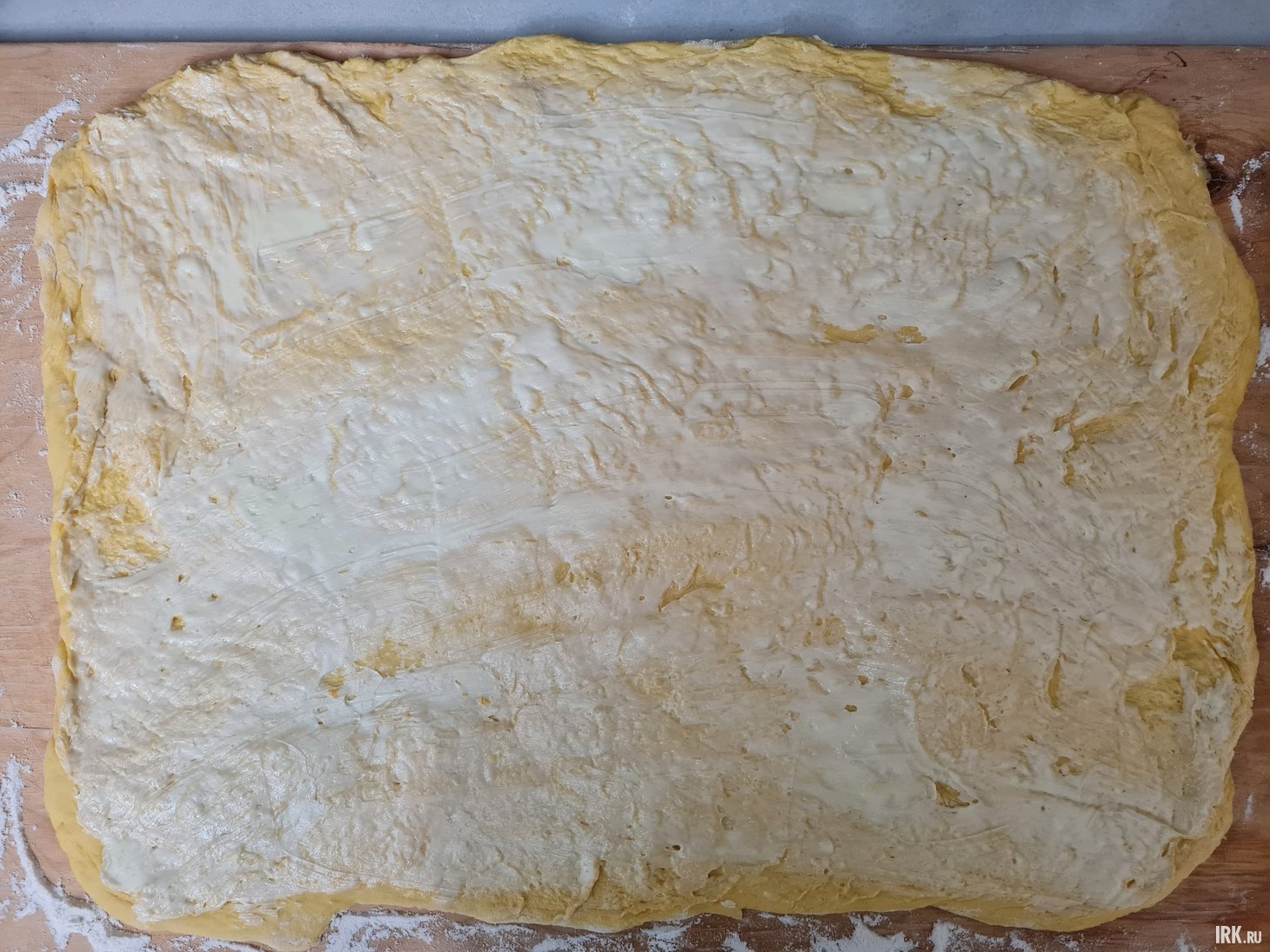 Стол или большую доску присыпьте мукой, раскатайте весь объем теста в тонкий (примерно 5-6 миллиметров толщиной) прямоугольный лист. Если скалка будет липнуть, припорошите еще немного. Теперь смажьте мягким сливочным маслом (50 грамм) с помощью силиконовой кисточки или лопатки.