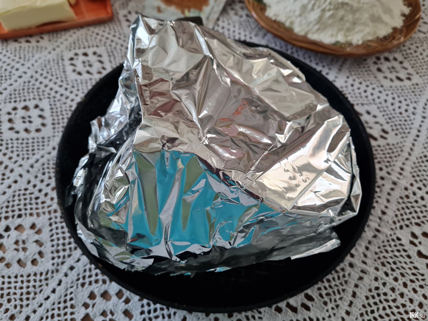 Оставляем для расстойки на 1 час, прикрыв сверху полотенцем. Пирог поднимется. Заранее включите духовку на 180 градусов.