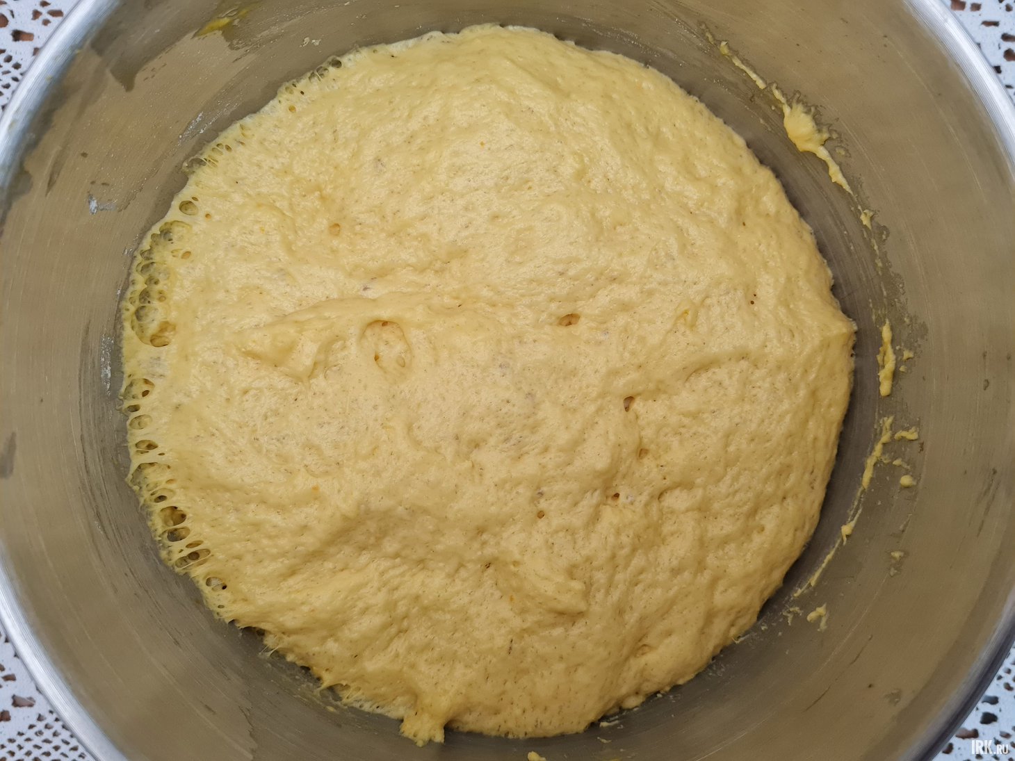 Теперь в массу всыпьте соль, 1 столовую ложку сахара, добавьте подготовленное тыквенное пюре и 50 грамм растопленного сливочного масла.