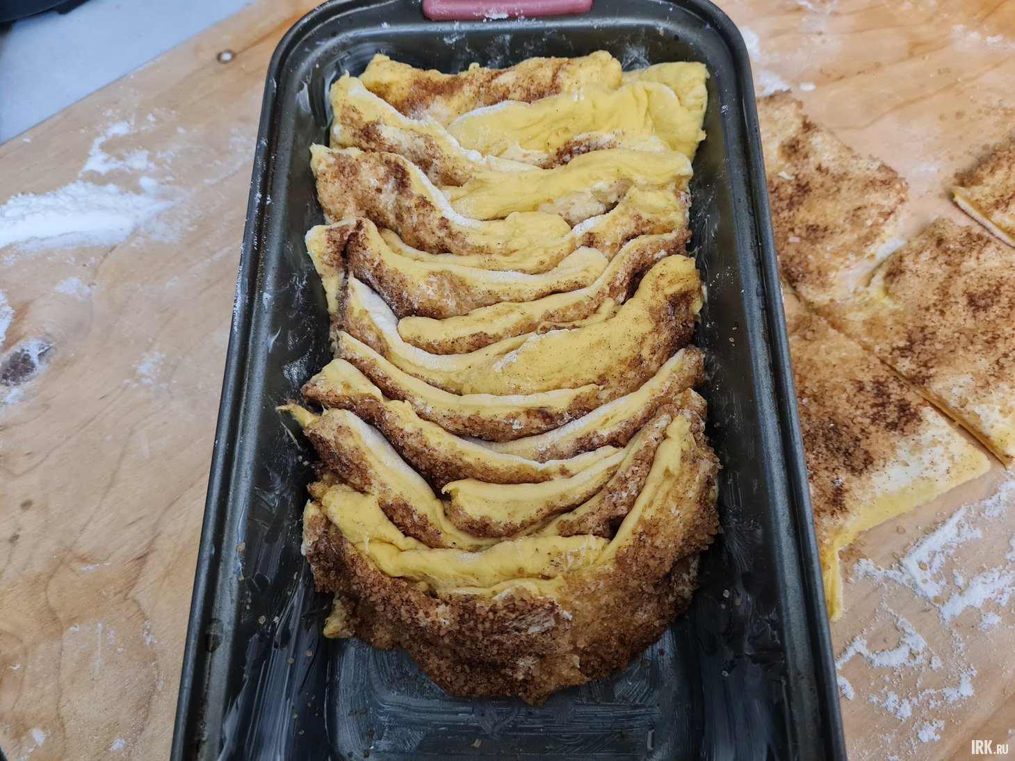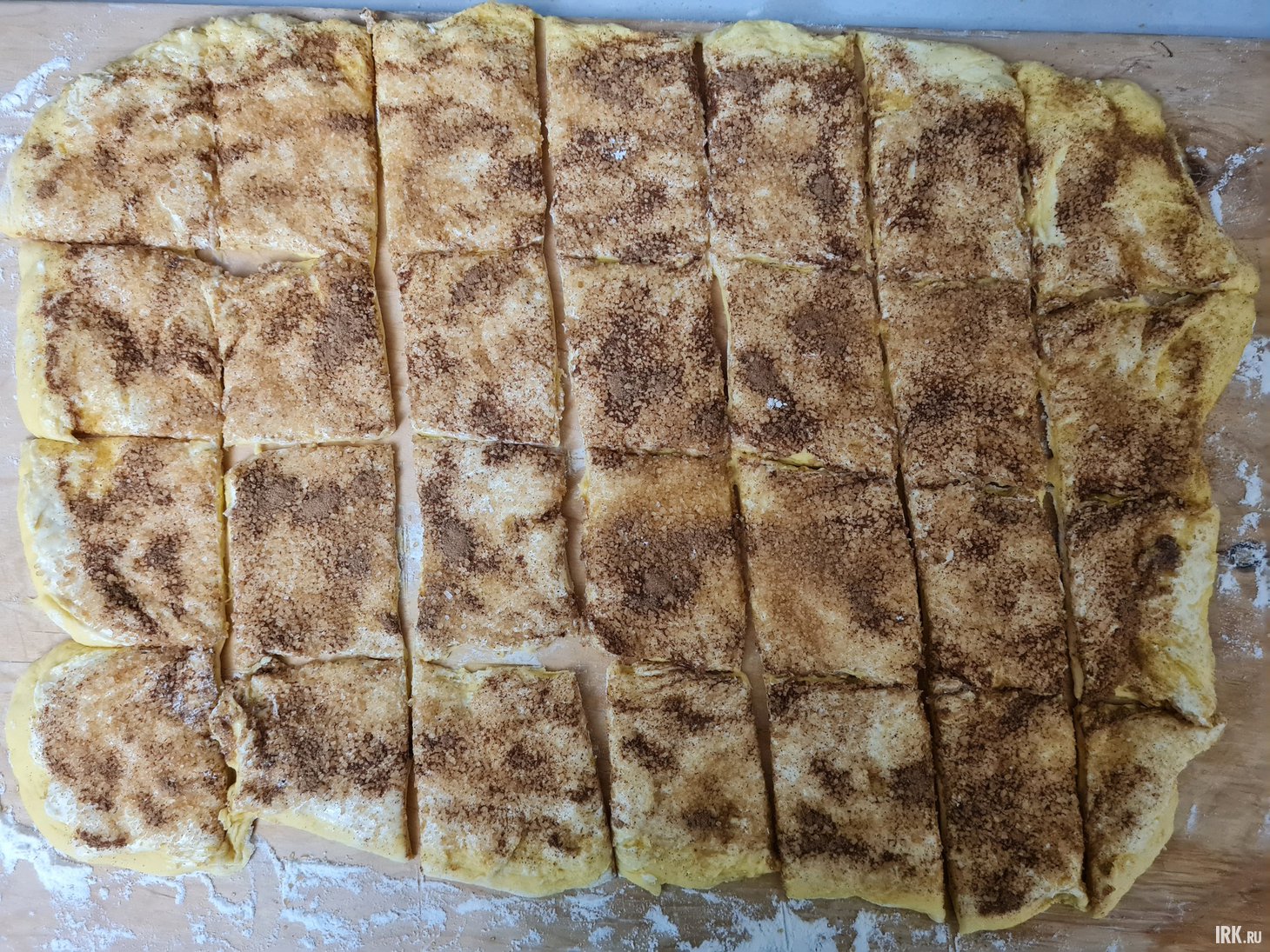 Разрежьте лист теста по горизонтали на 4 полоски, а затем по вертикали на квадраты примерно одного размера. У меня получилось 28 штук.