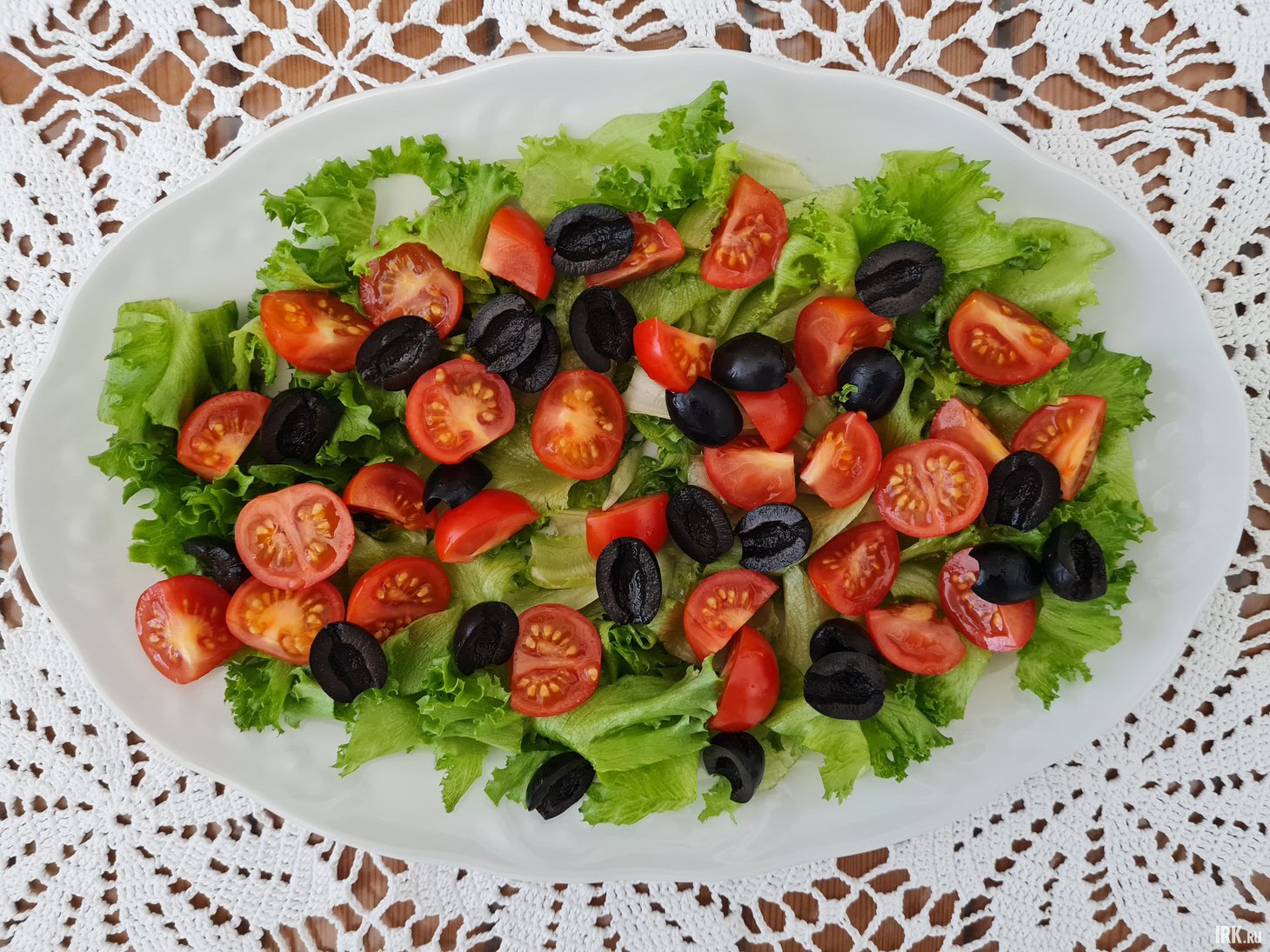Нарежьте маслины пополам, черри — на 2—4 части в зависимости от размера. Распределите на листьях салата.