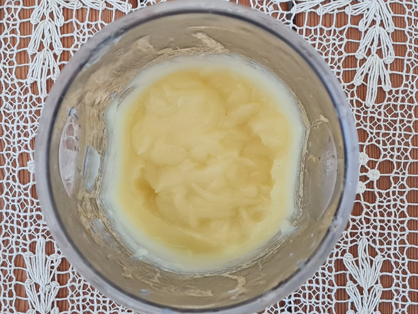 Если в процессе запекания выделится сок, то можете выпить его или добавить в чай – в майонезе лишняя жидкость нам не нужна. Сразу измельчите горячие яблоки блендером до состояния однородного пюре.
